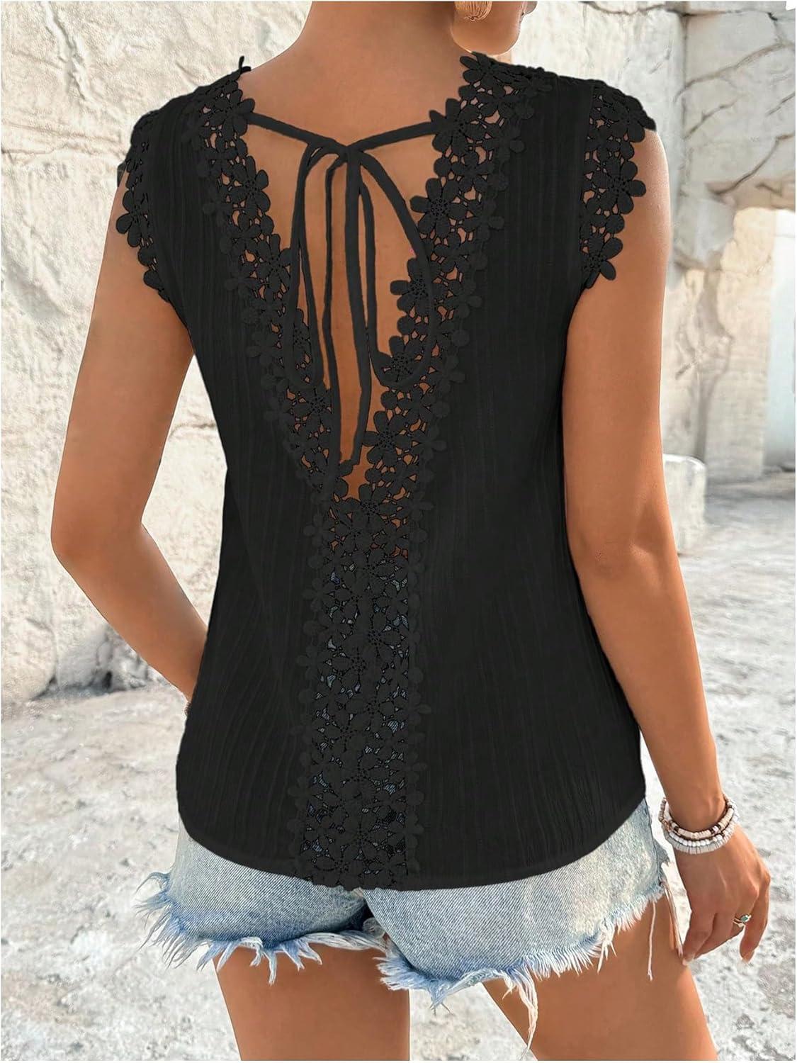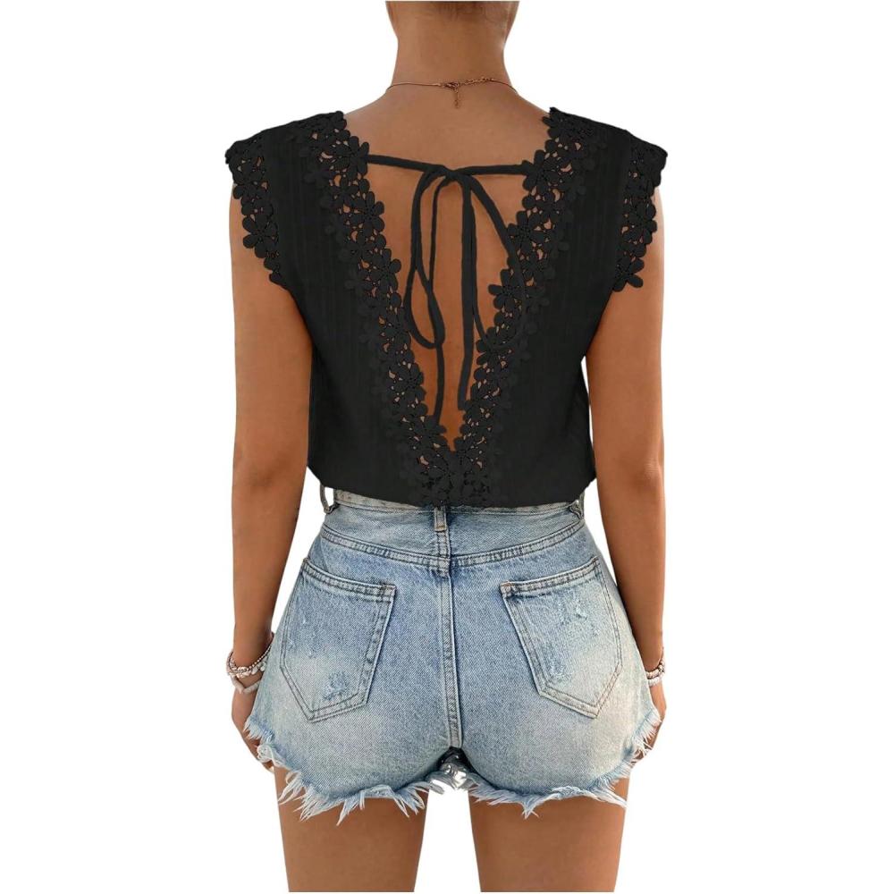 MakeMeChic Women's Lace Trim Tops Tie Backless Sleeveless Crew Neck Summer Shirts(Black)