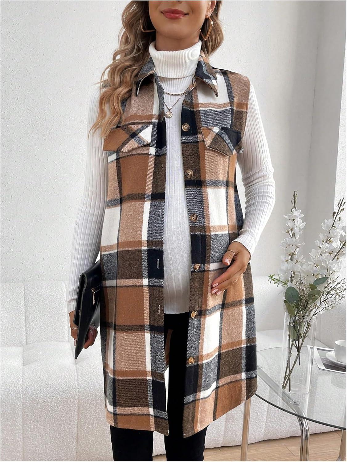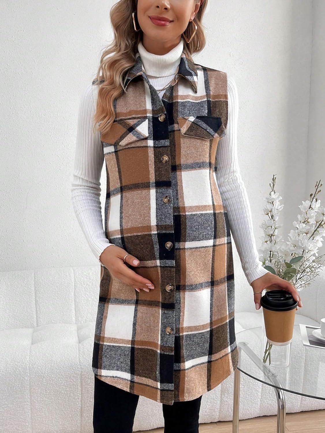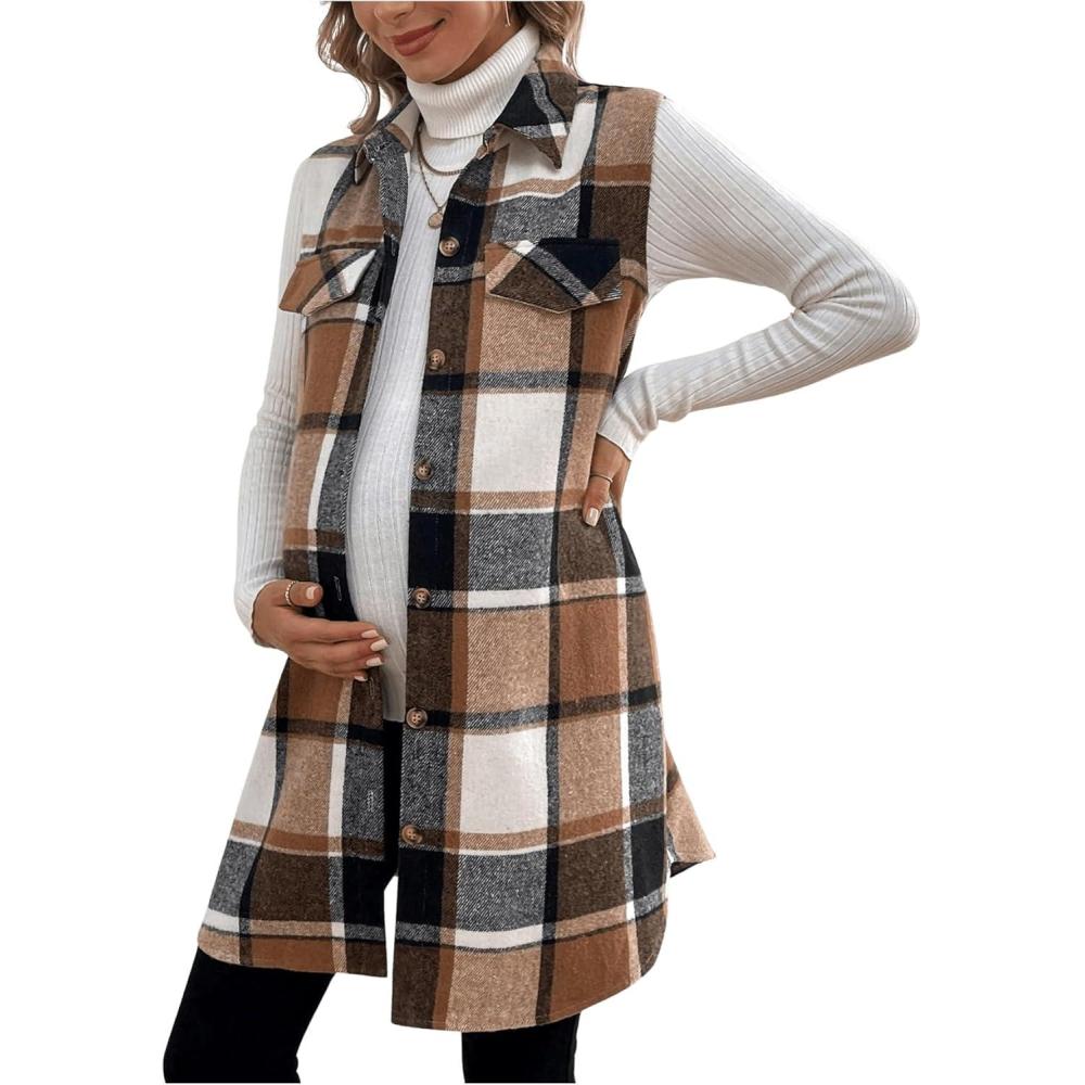 MakeMeChic Women’s Maternity Vest Outerwear Plaid Print Collared Button Down Pregnancy Midi Coat(Brown)