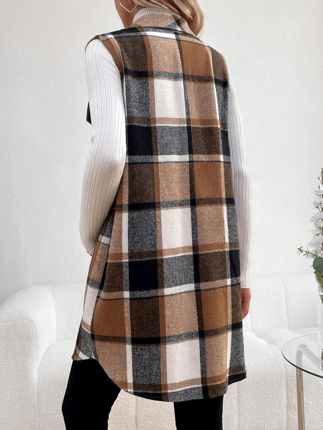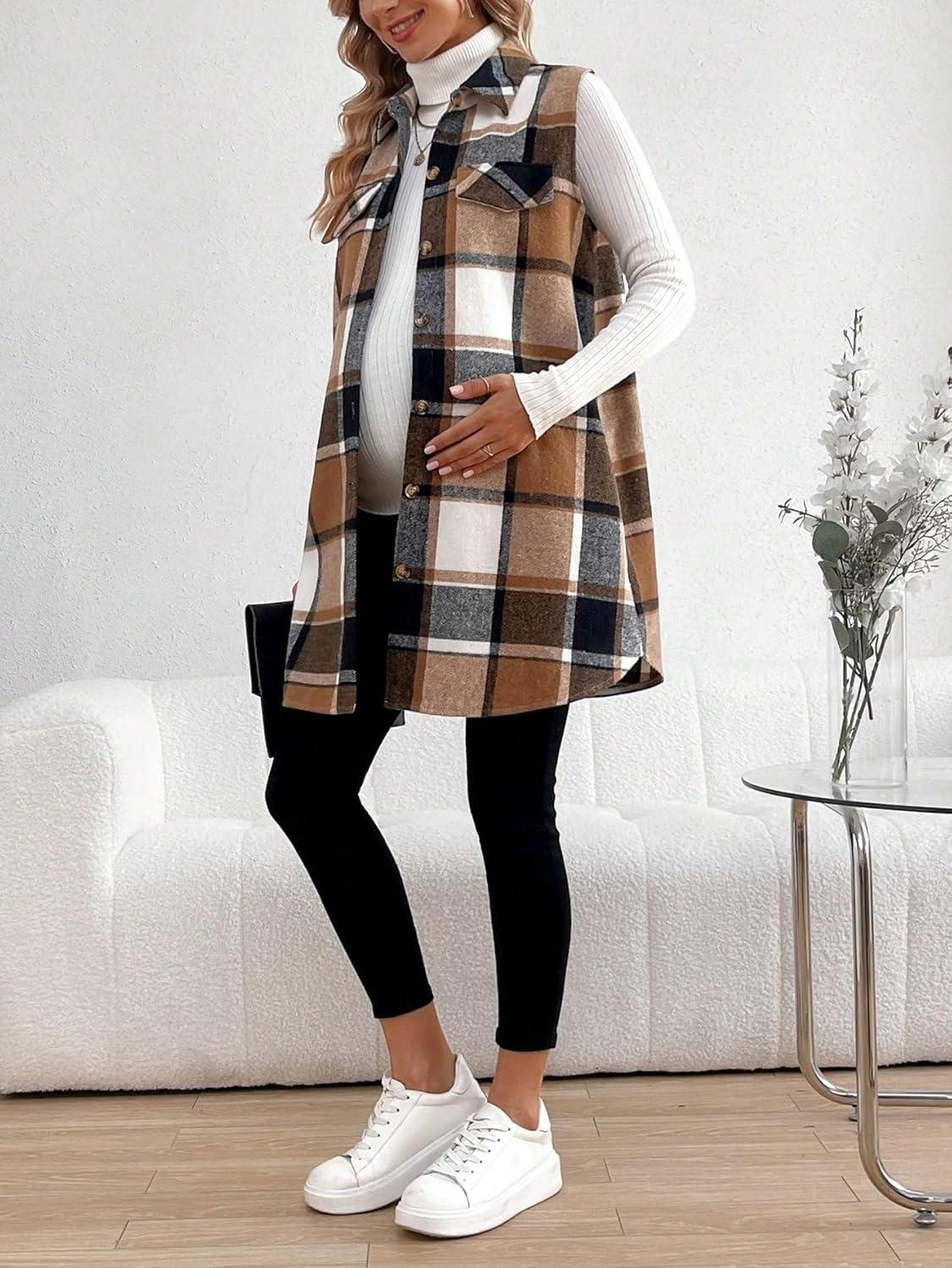 MakeMeChic Women's Maternity Vest Outerwear Plaid Print Collared Button Down Pregnancy Midi Coat(Brown)