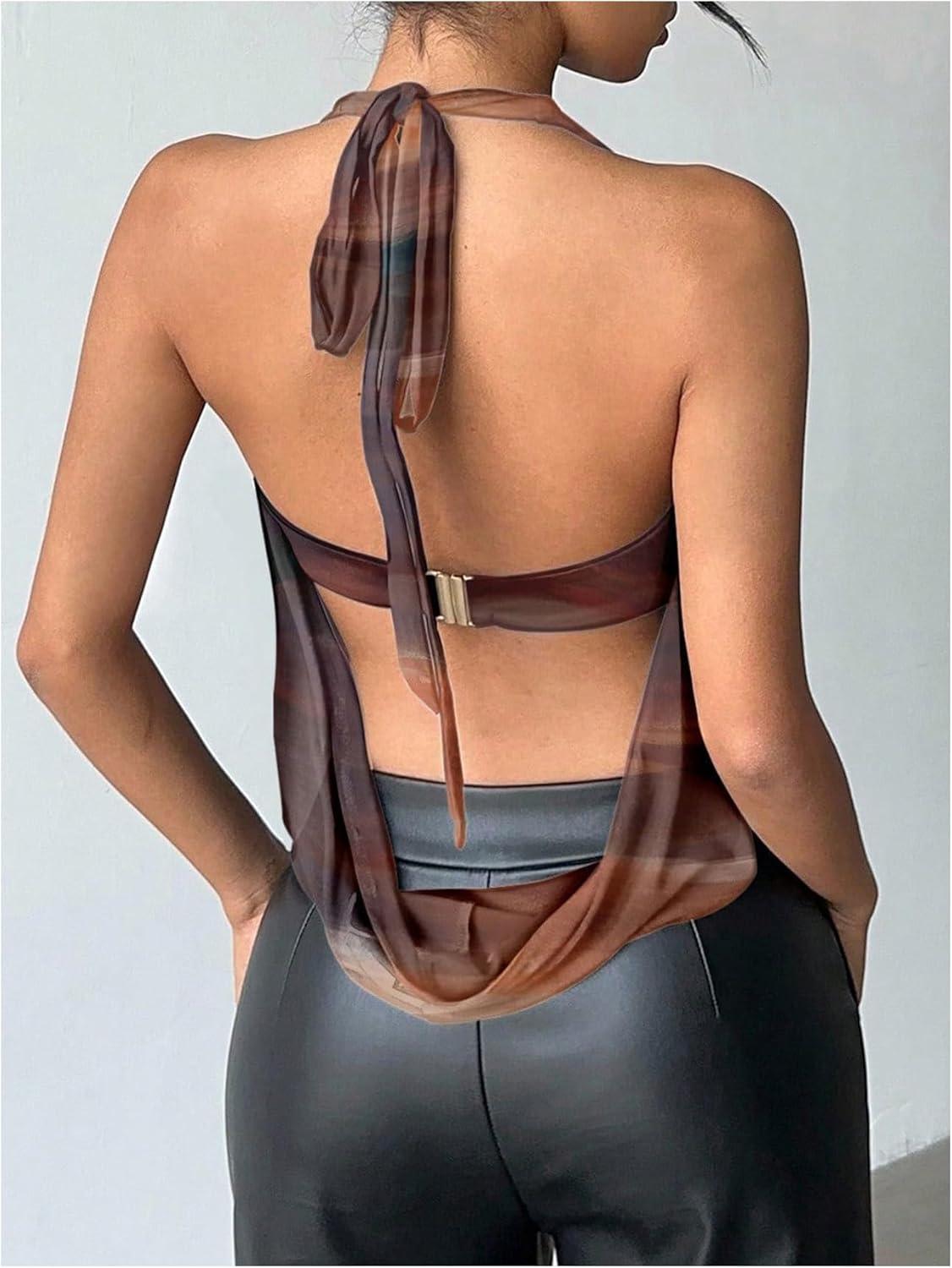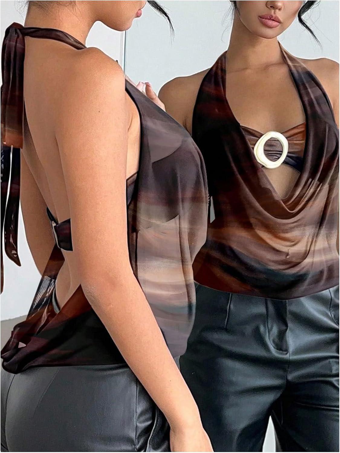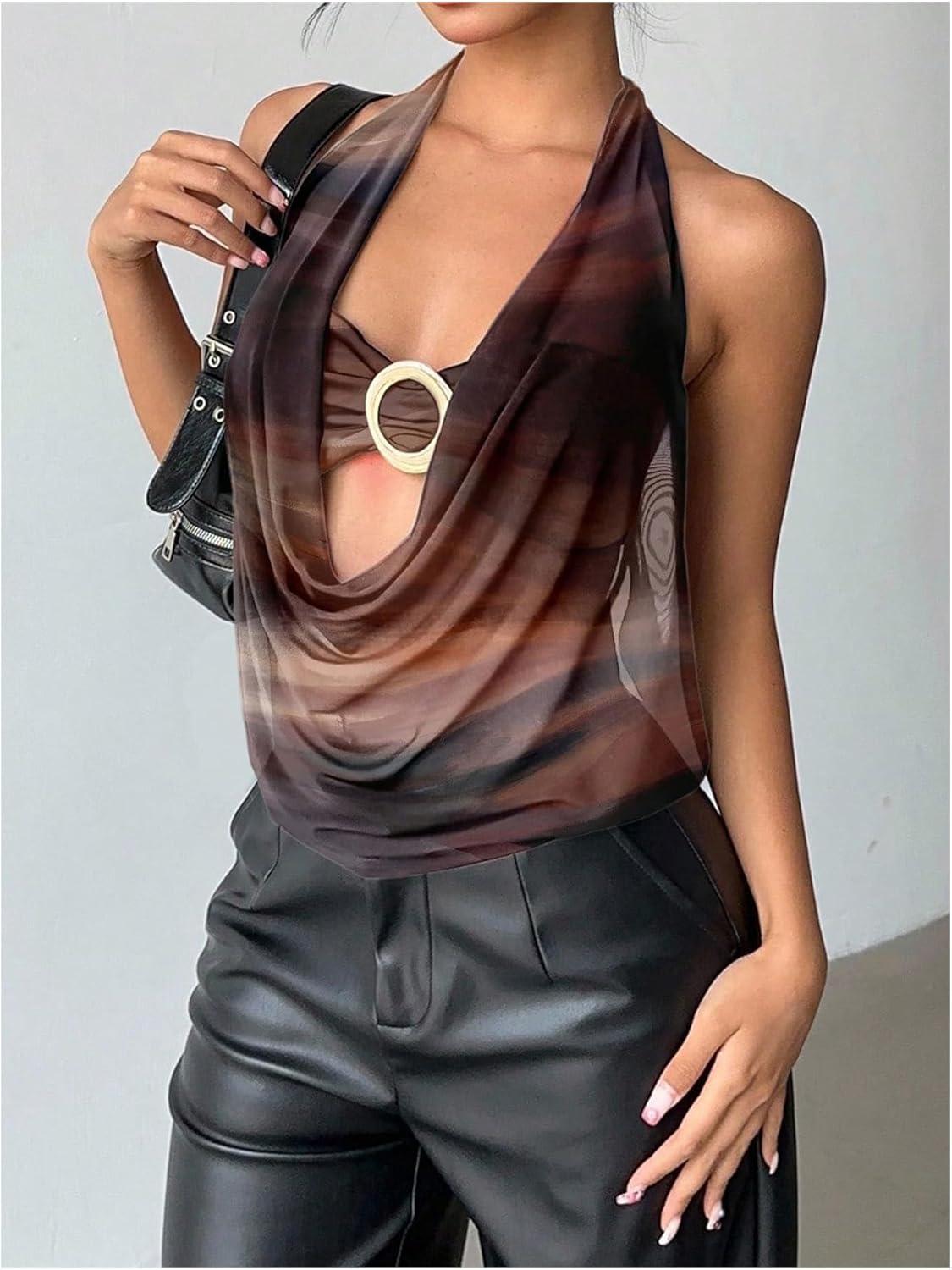 MakeMeChic Women’s Mesh Tie Open Back Halter Tops Draped Y2k Tank with Metal Ring Bendeau Bra(Multicolor)