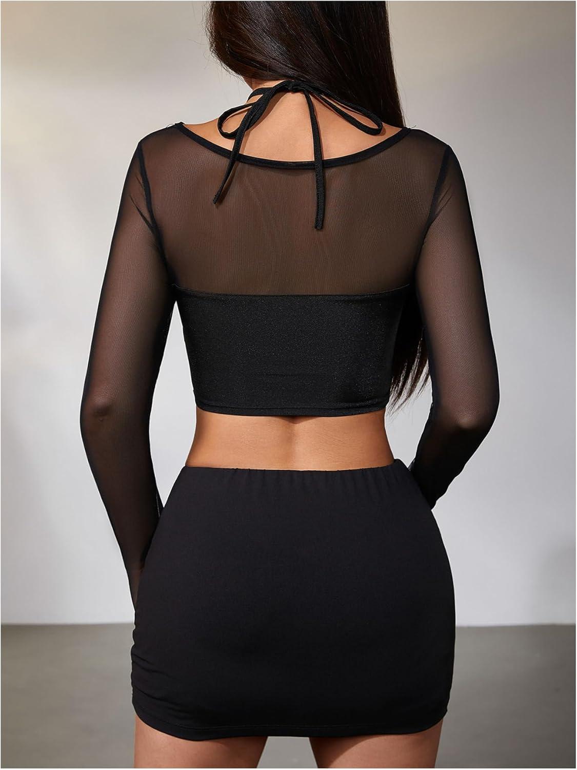 MakeMeChic Women's Mesh Top Y2K Rave Top Cut Out Crop Long Sleeve Tie Back Party Tee Shirts(Black)