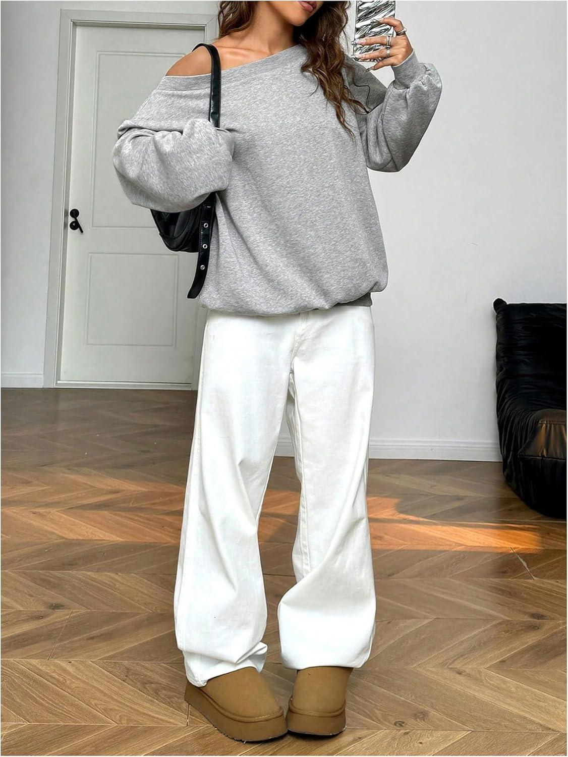 MakeMeChic Women’s Off The Shoulder Sweatshirt Tops Long Sleeve Oversized Sweatshirts(Light Grey)