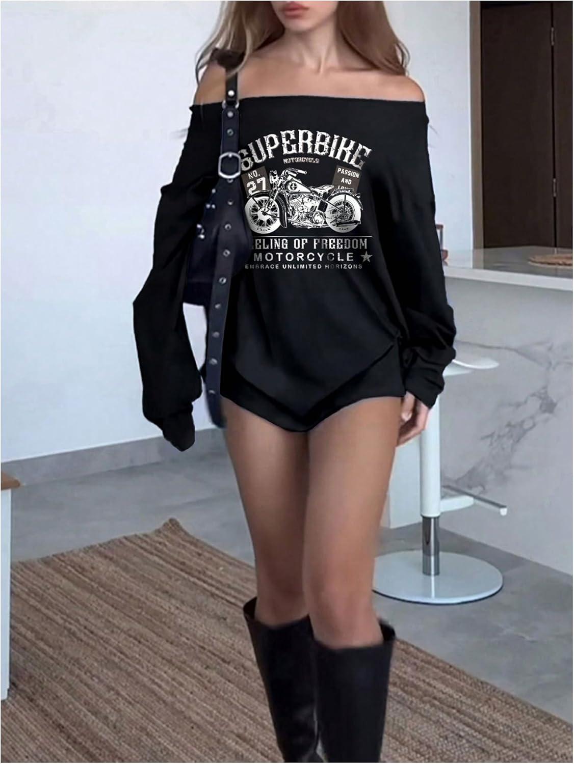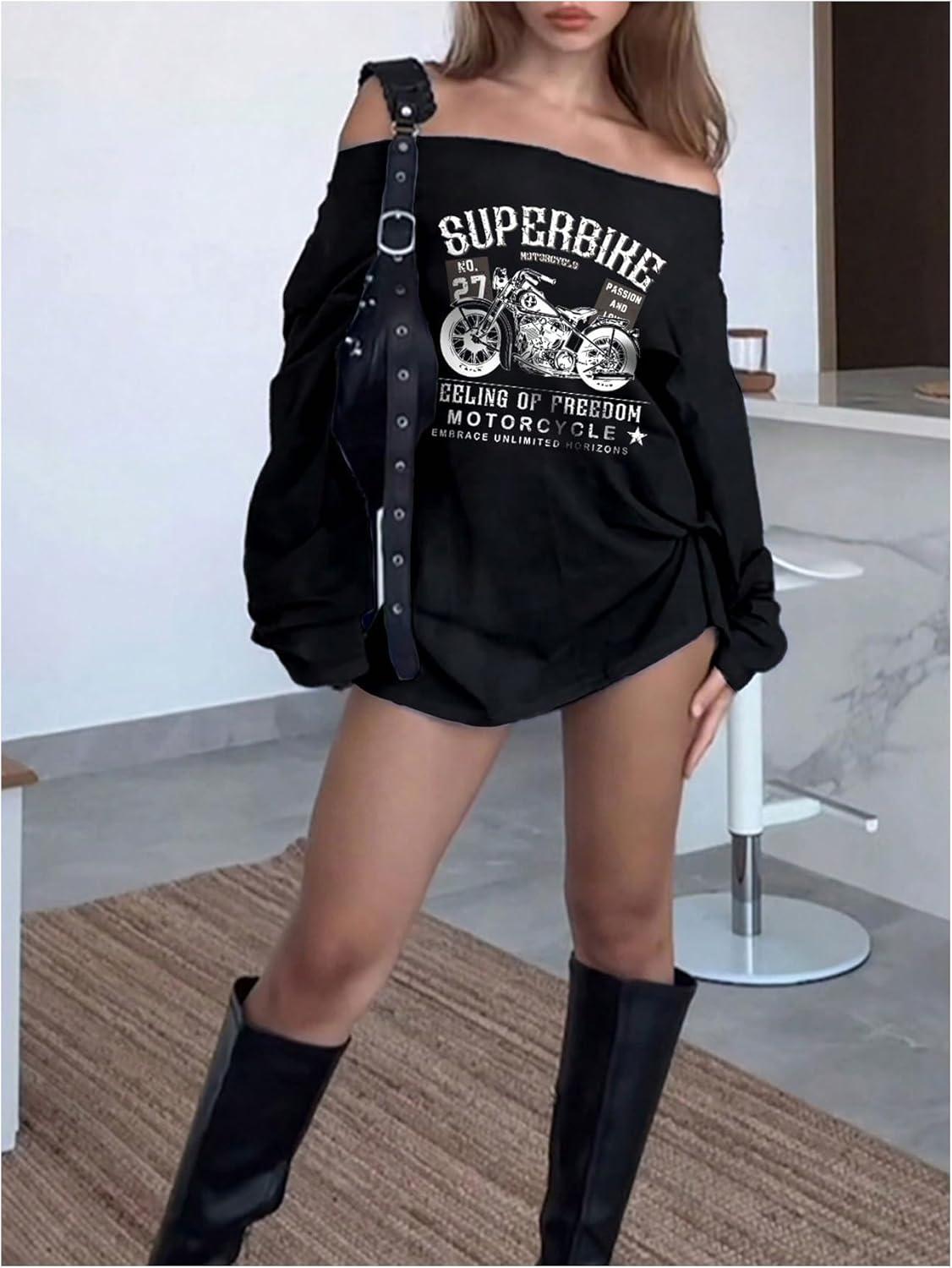 MakeMeChic Women’s Off The Shoulder Sweatshirt Tops Y2k Oversized Graphic T Shirt(Black)