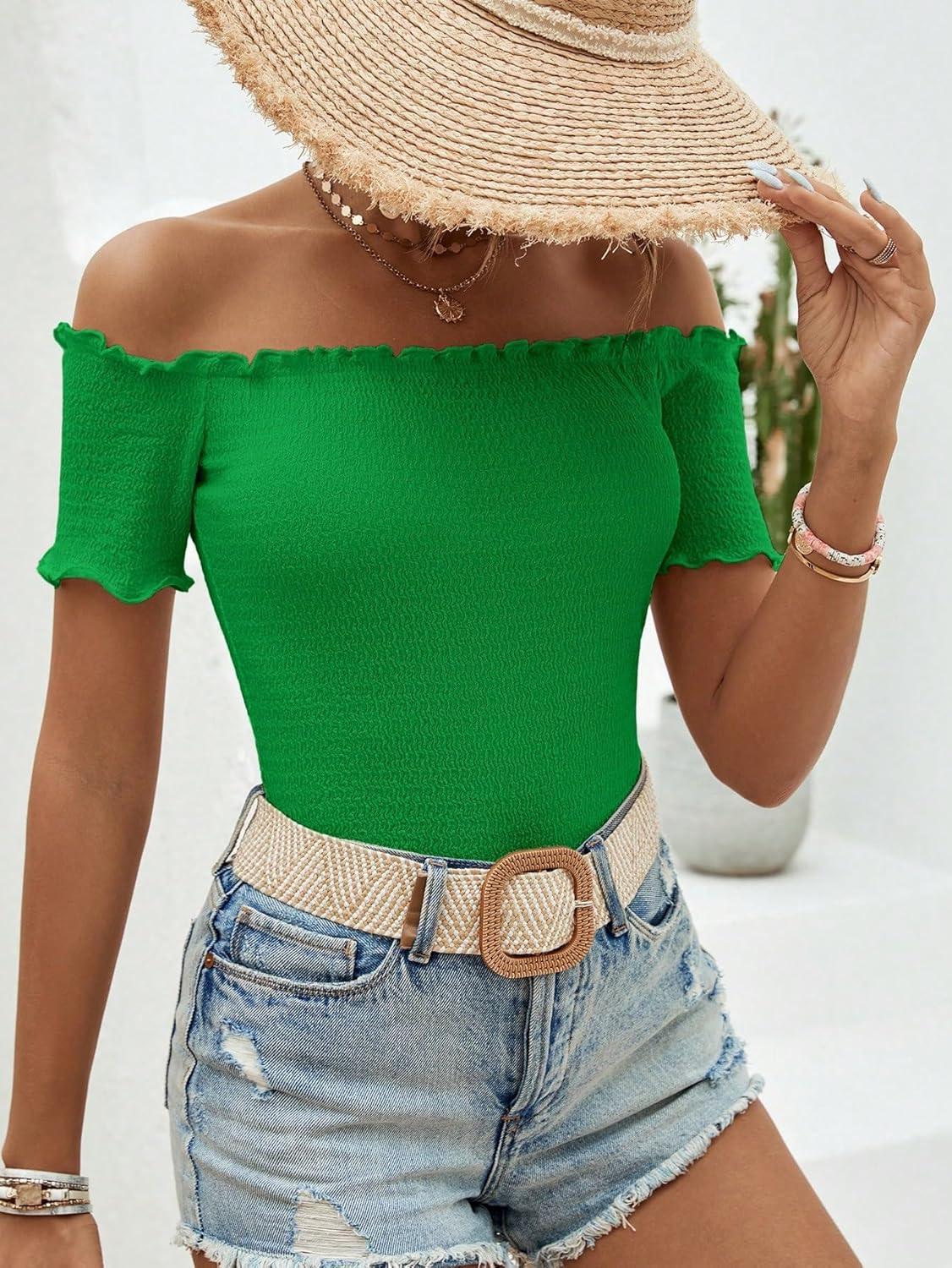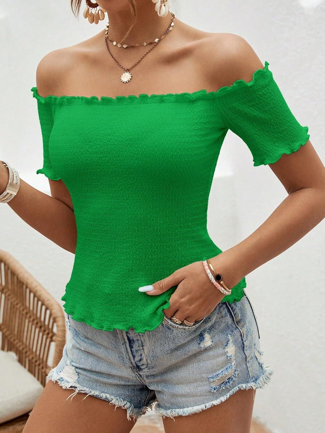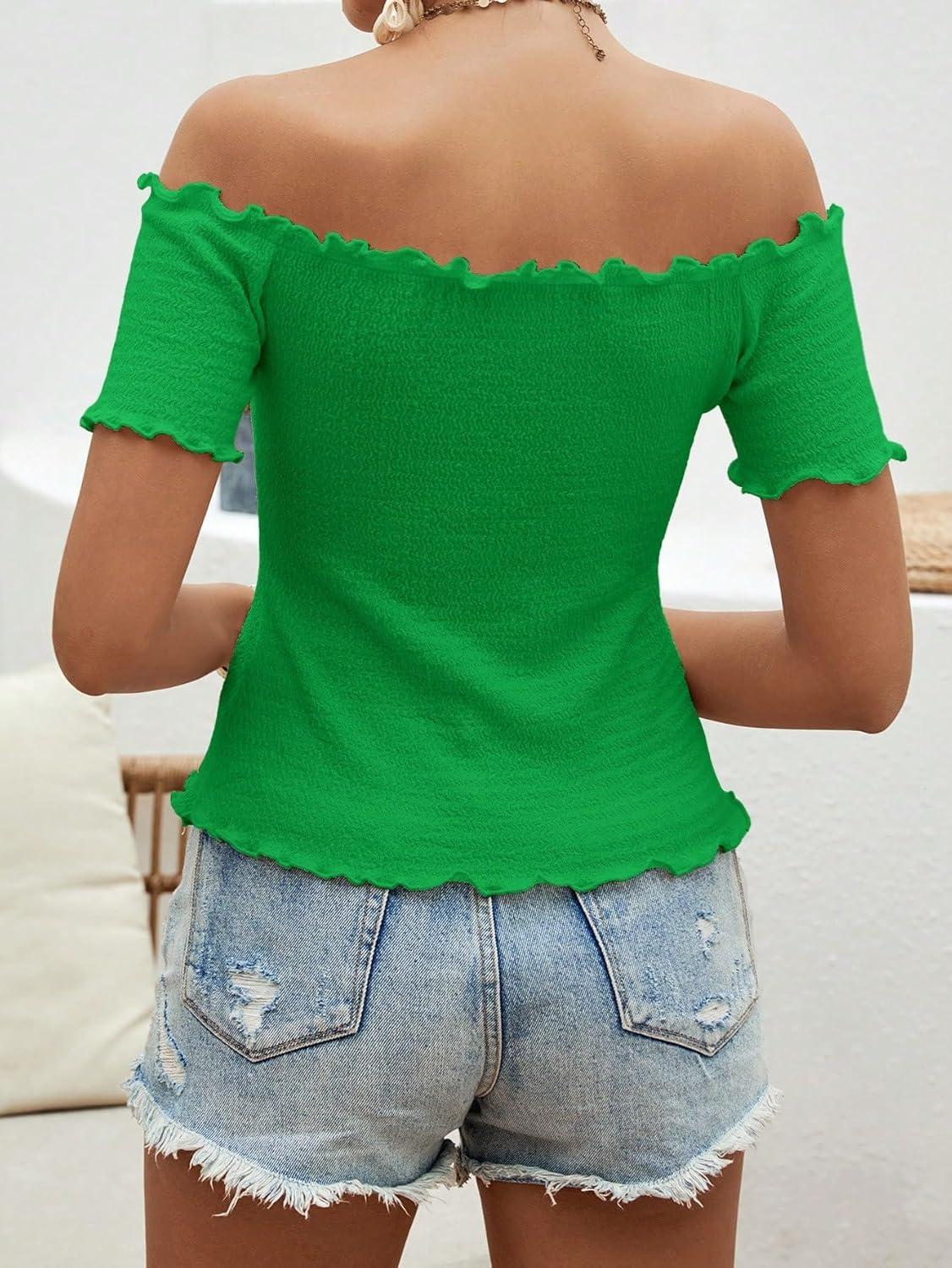MakeMeChic Women’s Off The Shoulder Top Lettuce Trim Short Sleeve Fitted T Shirt(Green)