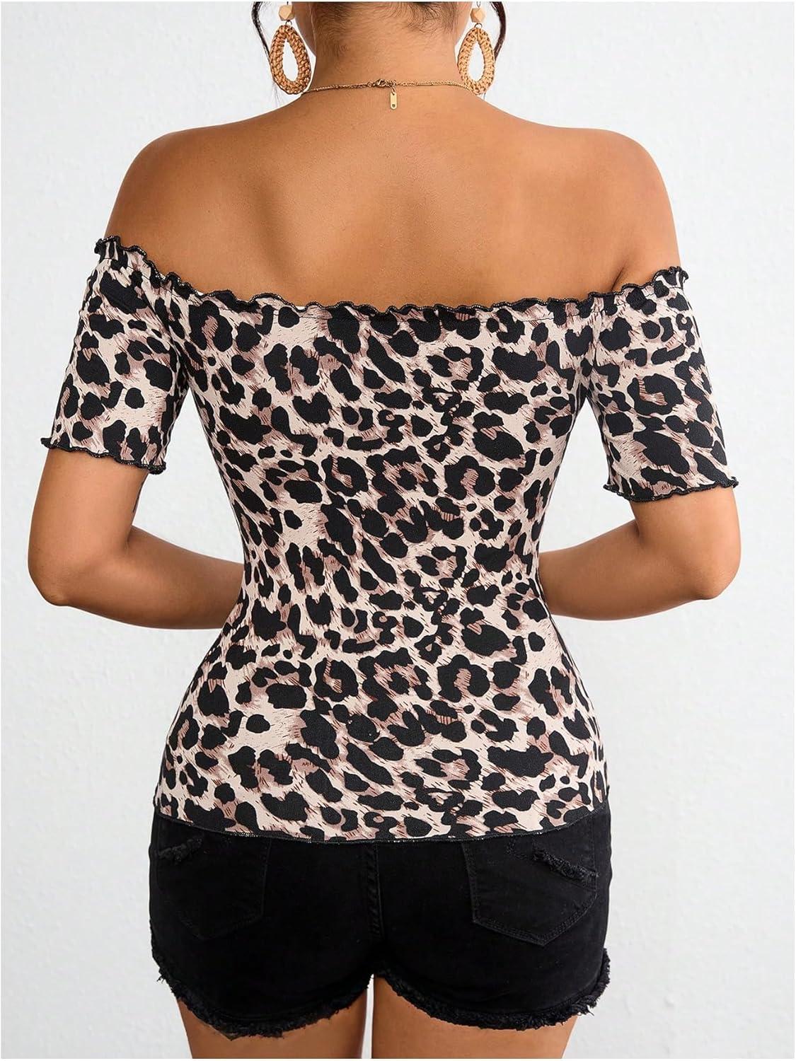 MakeMeChic Women's Off The Shoulder Top Lettuce Trim Short Sleeve Fitted T Shirt(Leopard Brown)