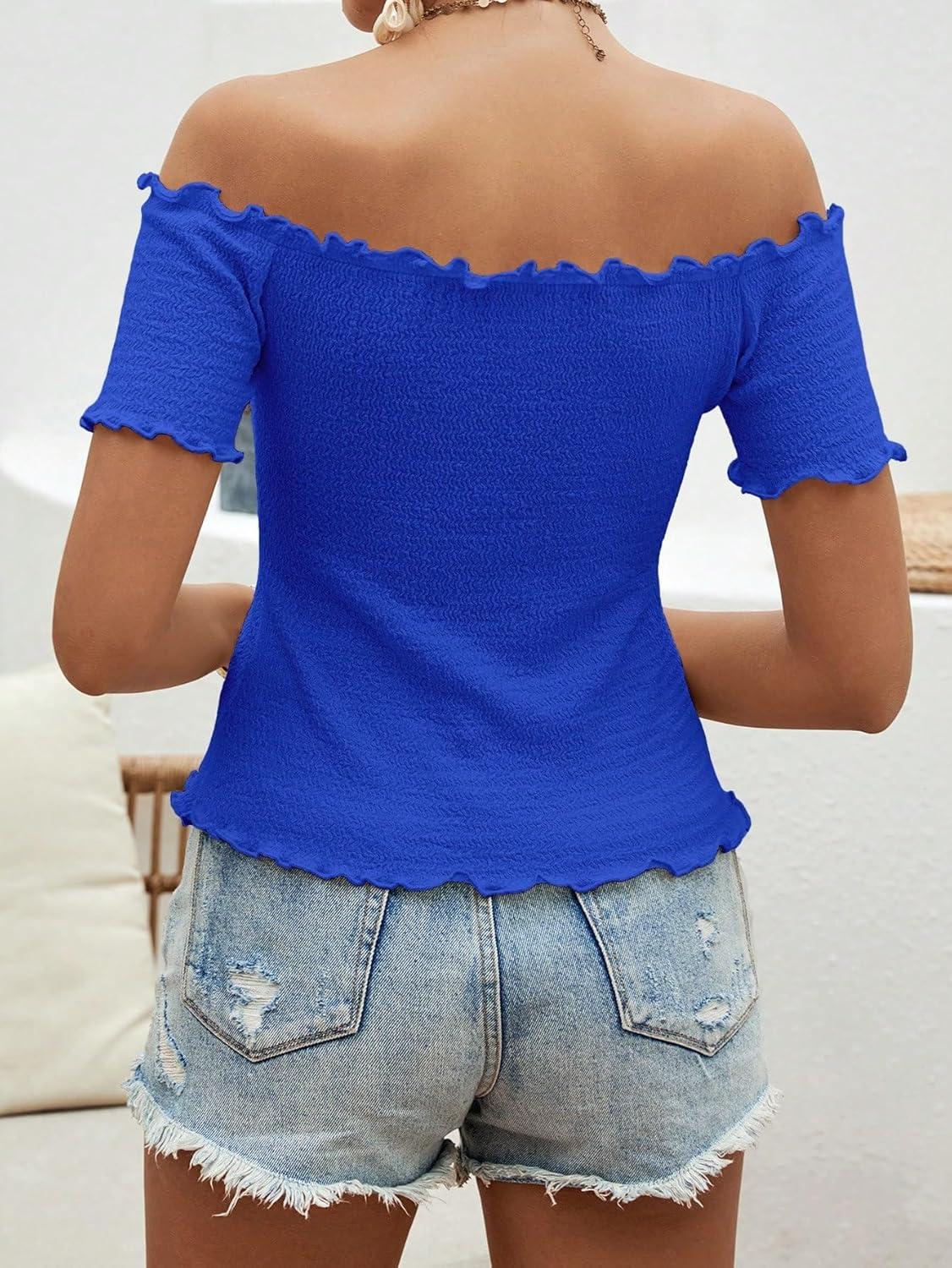 MakeMeChic Women’s Off The Shoulder Top Lettuce Trim Short Sleeve Fitted T Shirt(Royal Blue)