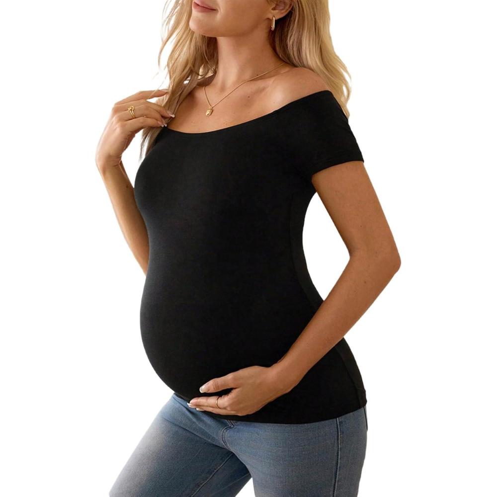 MakeMeChic Women’s Off The Shoulder Tops Maternity Clothes Short Sleeve Casual Fitted Pregnancy Shirts(Black)