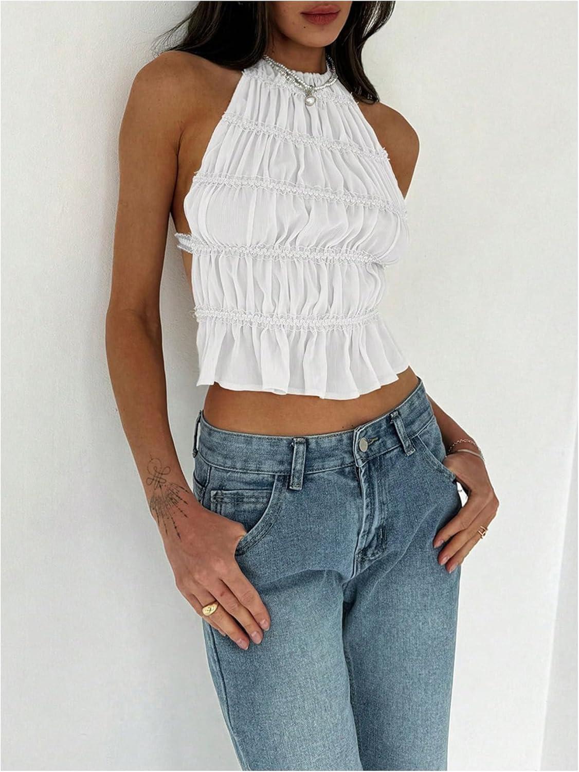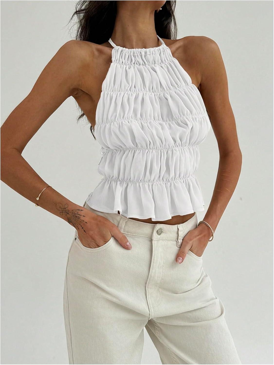 MakeMeChic Women's Open Back Halter Top Sleeveless Tie Backless Y2K Crop Going Out Tops(White)