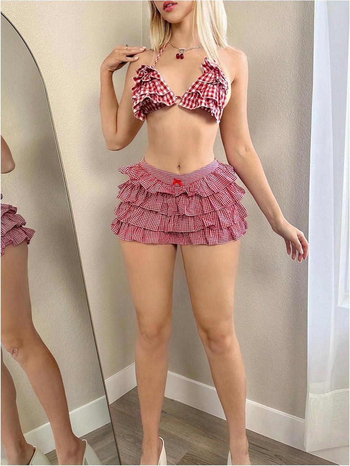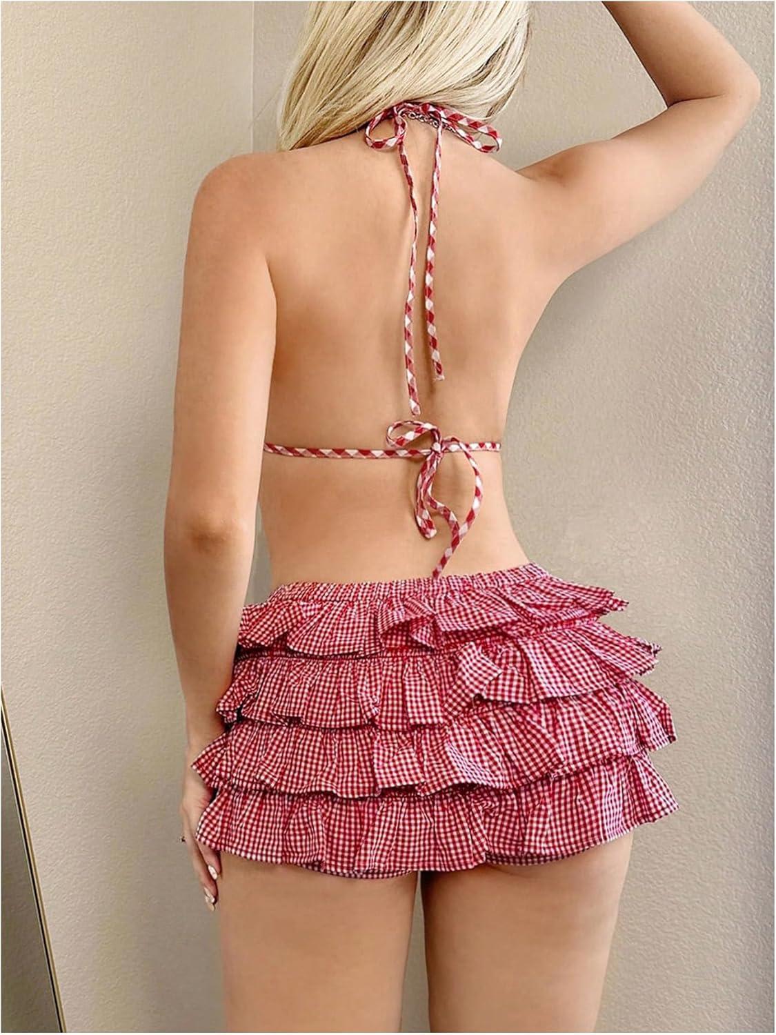 MakeMeChic Women’s Plaid Elastic Waist Ruffle Tiered Bow Front Gingham Summer Mini Shorts(Red)