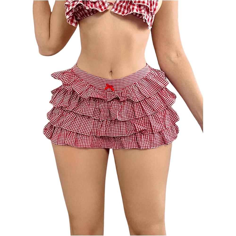 MakeMeChic Women's Plaid Elastic Waist Ruffle Tiered Bow Front Gingham Summer Mini Shorts(Red)