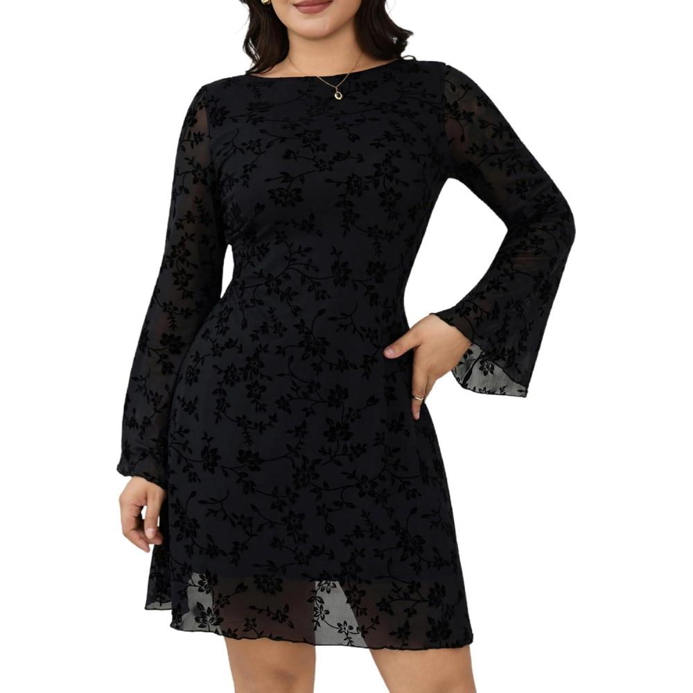 MakeMeChic Women’s Plus Size Cocktail Dress Fall Leopard Print Dress Party Bell Sleeve Y2K Backless Going Out Mini Dresses(Floral)