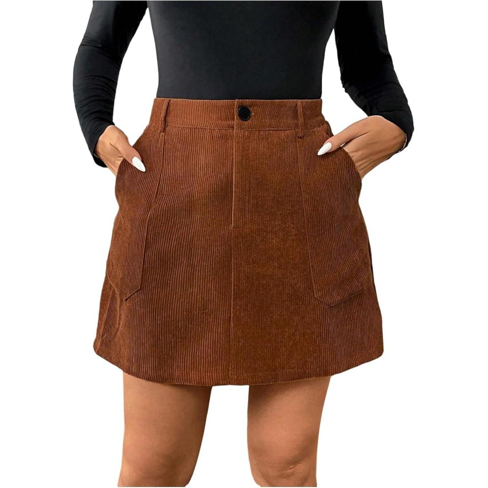 MakeMeChic Women’s Plus Size Corduroy Mini Skirt High Waisted Zip Fly A Line Button Fall Winter Skirts(Brown)