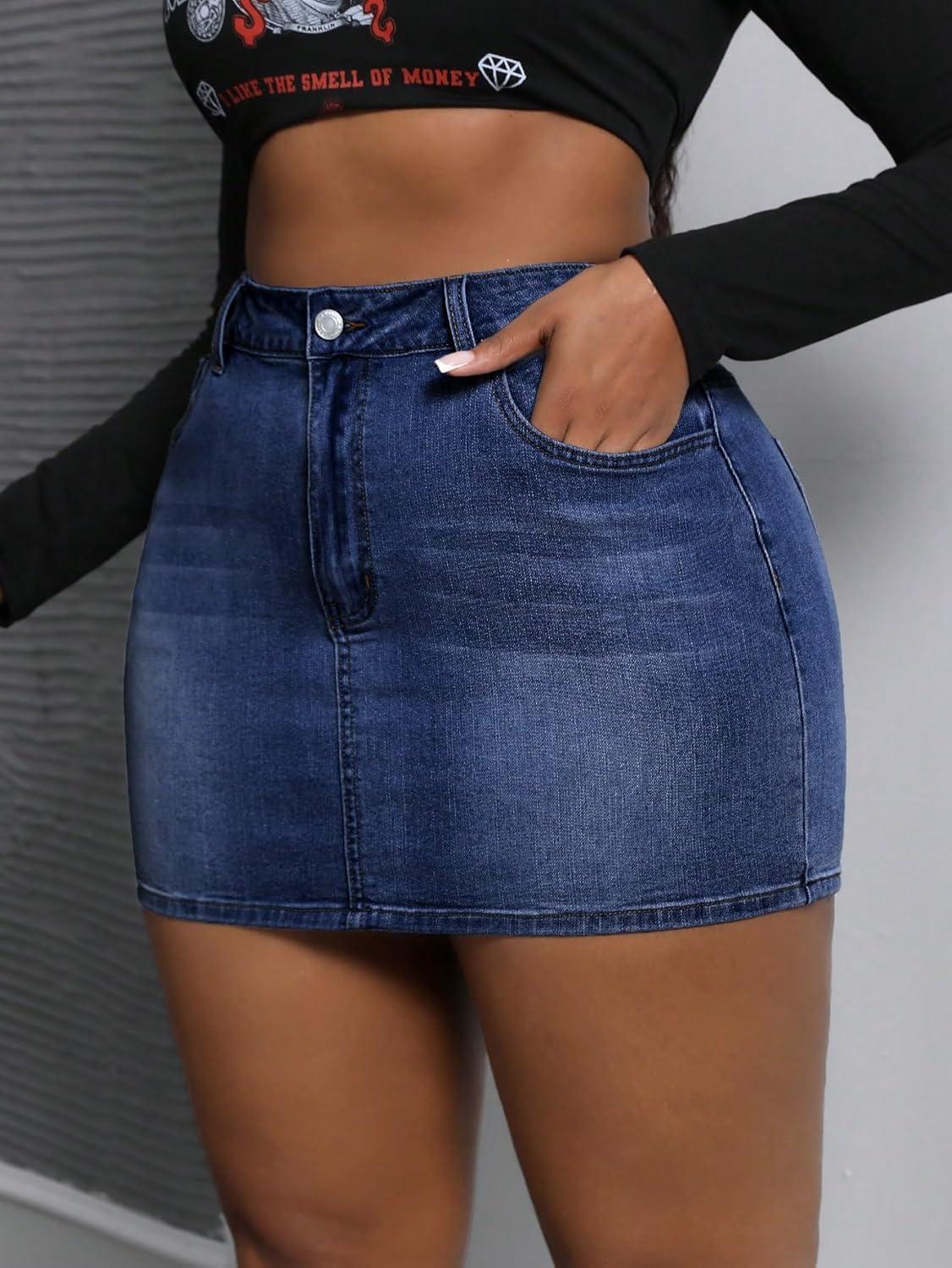 MakeMeChic Women's Plus Size Denim Skirt Mini High Waisted Zipper Bodycon Jean Skirt(Dark Wash C)