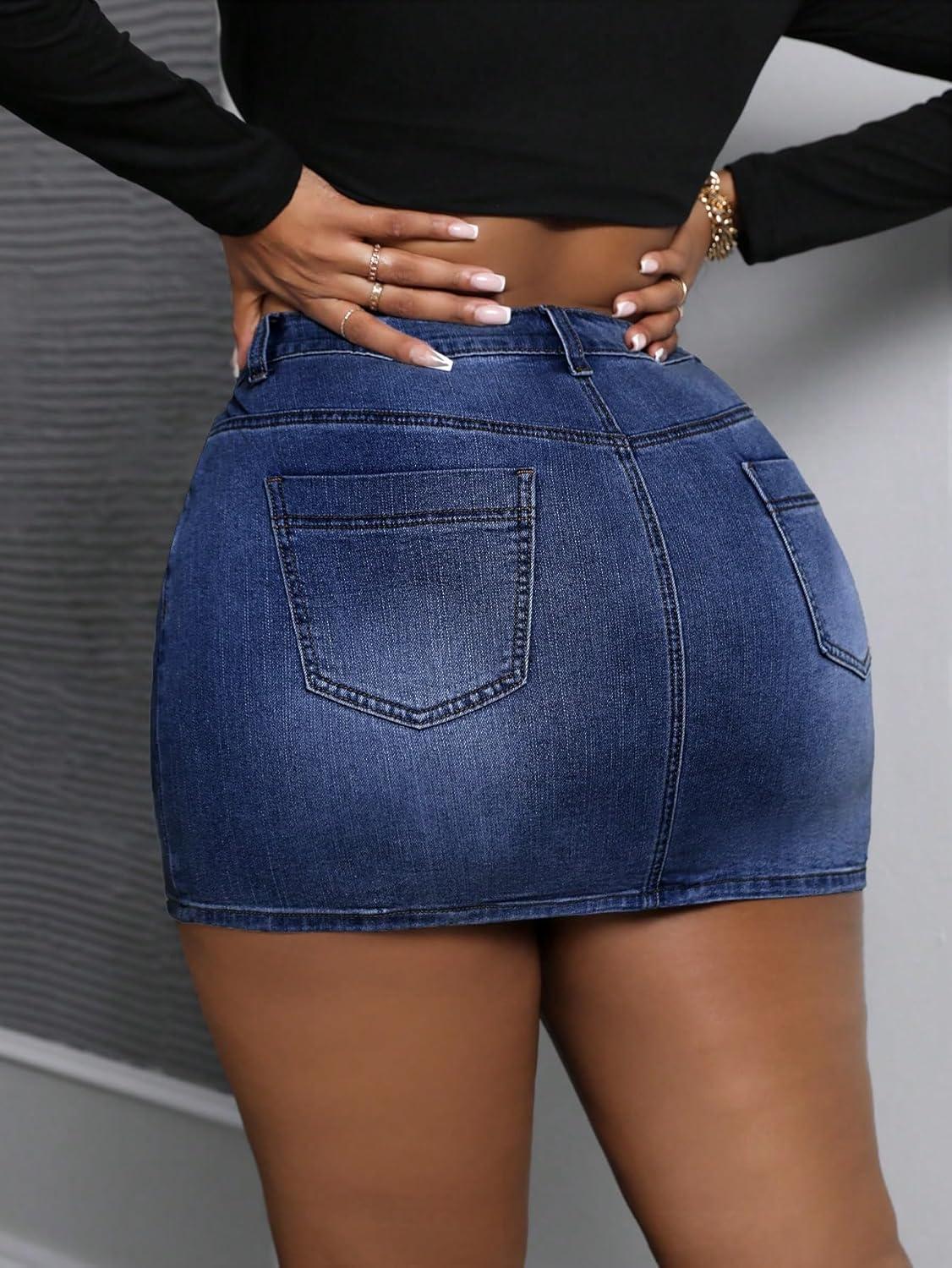 MakeMeChic Women’s Plus Size Denim Skirt Mini High Waisted Zipper Bodycon Jean Skirt(Dark Wash C)