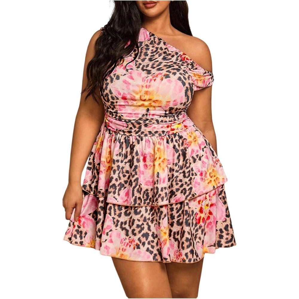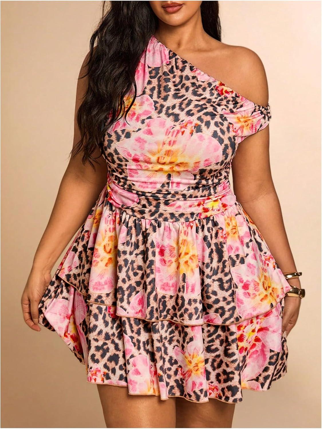MakeMeChic Women’s Plus Size Fall Dress Asymmetrical Neck Mini Dress Ruffle Tiered Cocktail Dresses(Multicolor)