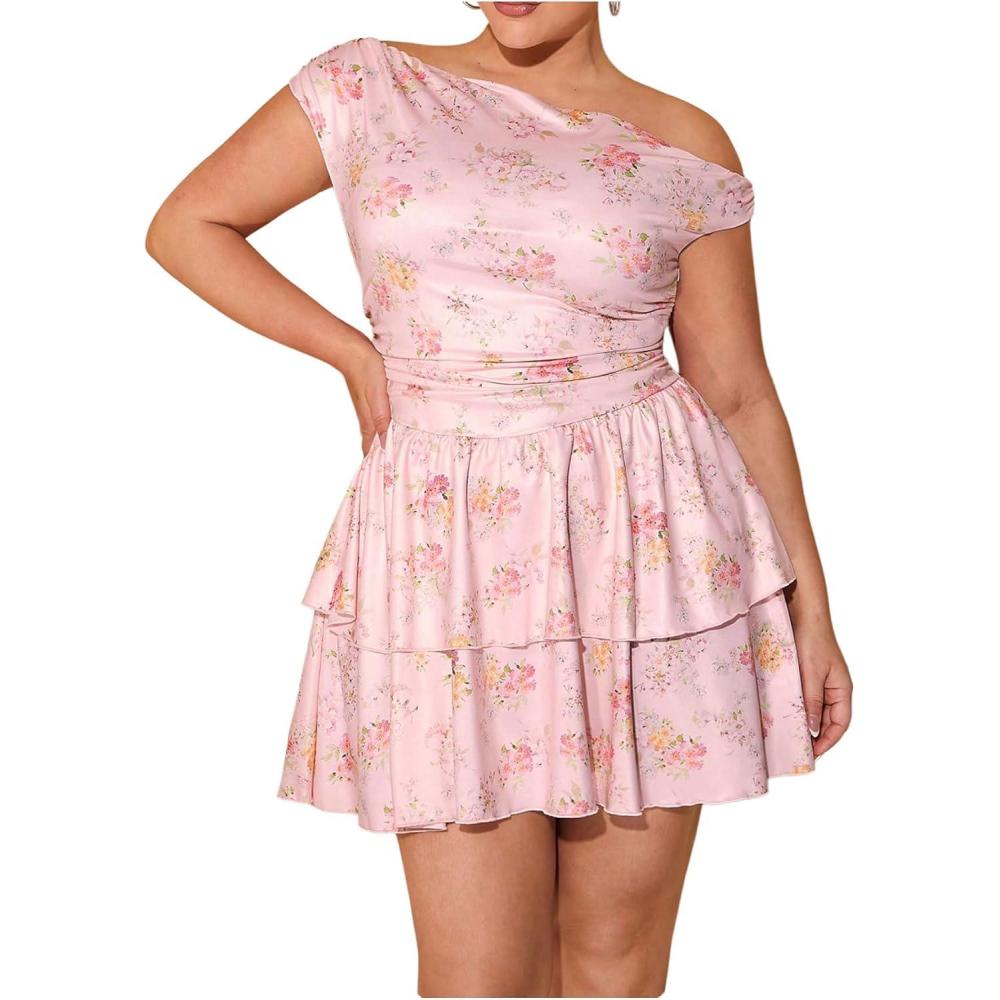 MakeMeChic Women’s Plus Size Fall Dress Asymmetrical Neck Mini Dress Ruffle Tiered Cocktail Dresses(Pink B)