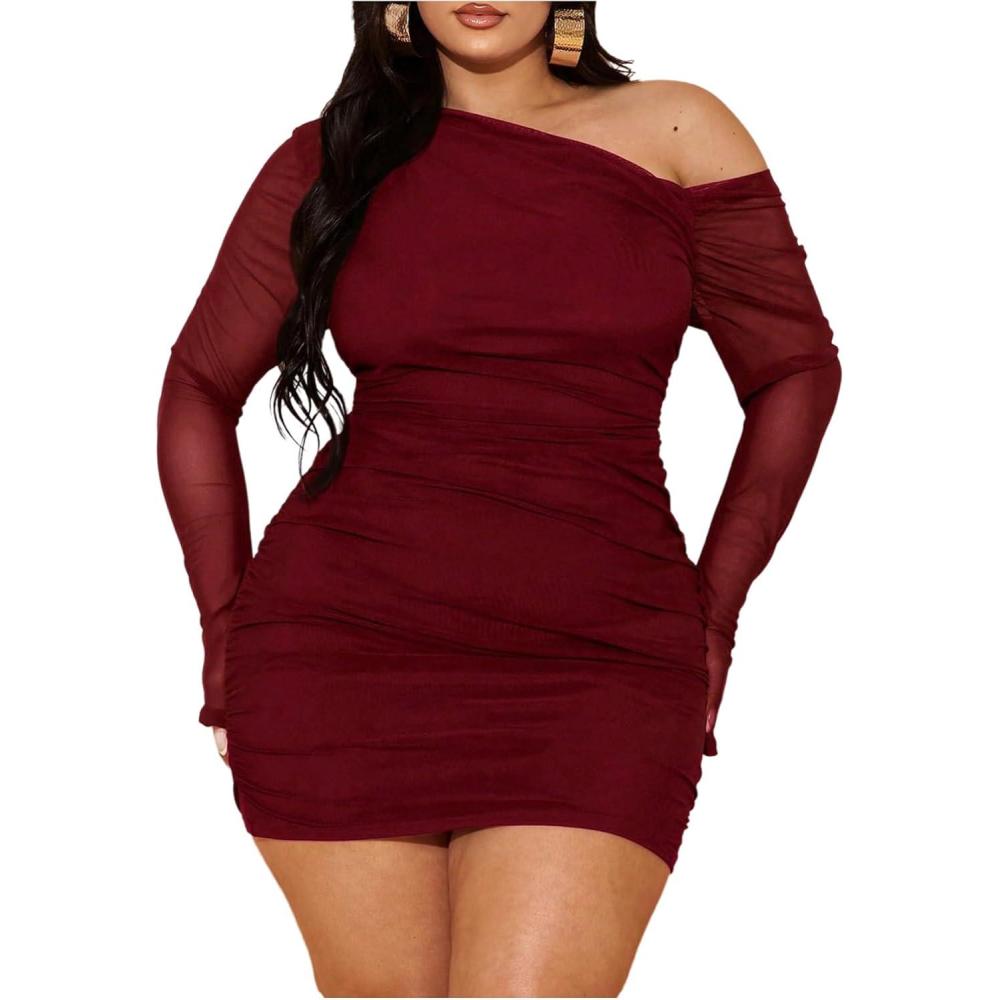 MakeMeChic Women’s Plus Size Fall Mini Dresses 2025 Mesh Ruched Bodycon One Shoulder Dresses(Burgundy)