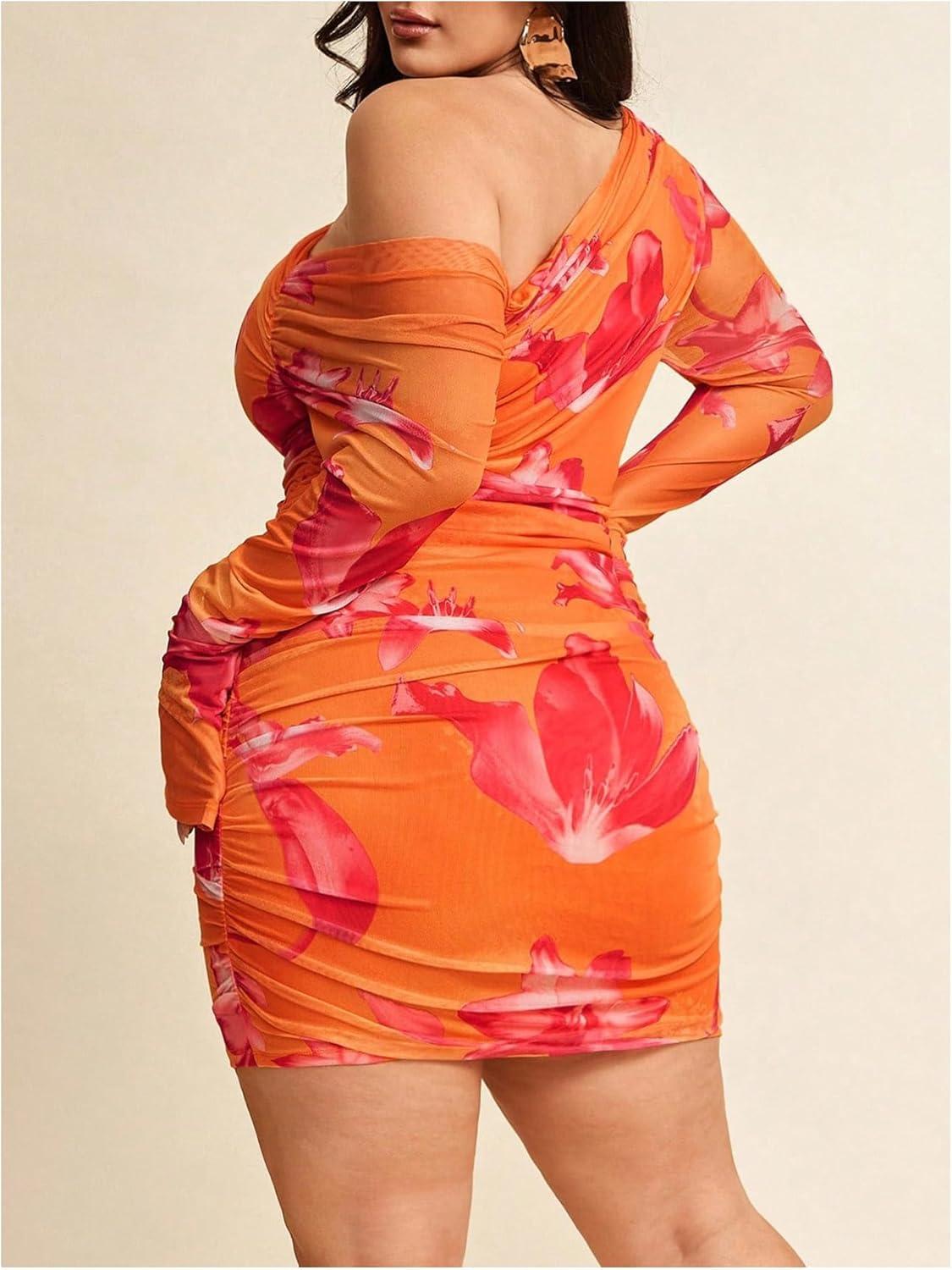 MakeMeChic Women’s Plus Size Fall Mini Dresses 2025 Mesh Ruched Bodycon One Shoulder Dresses(Orange)