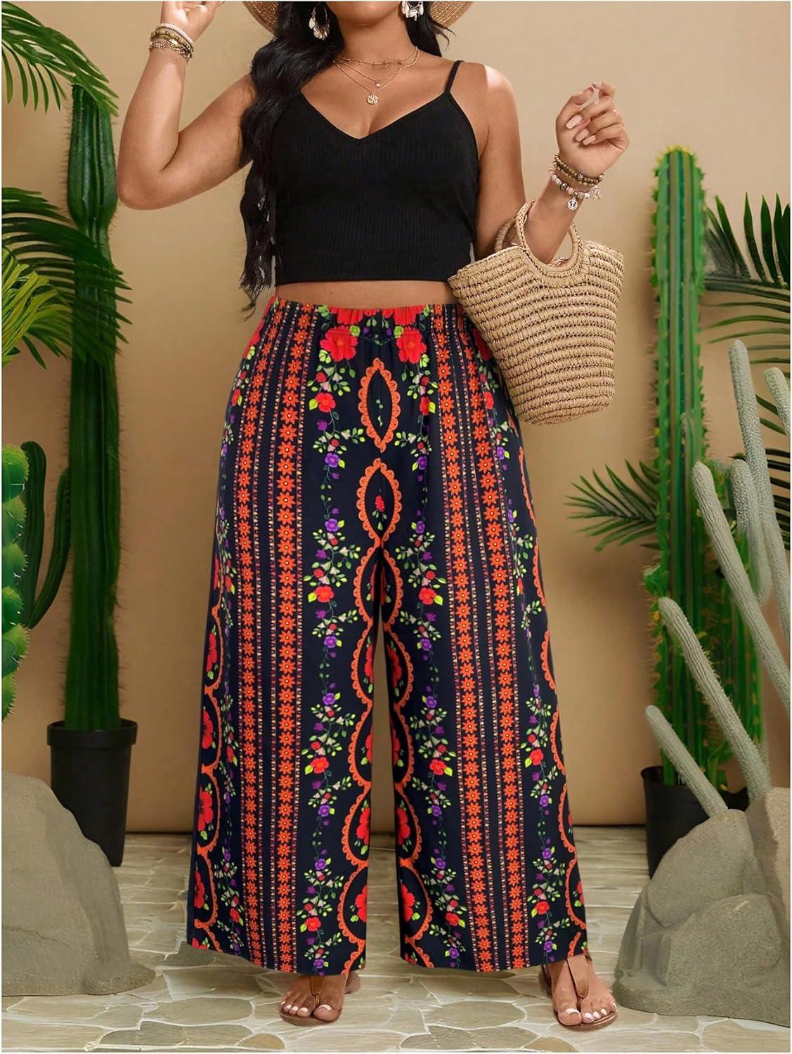 Don’t miss out on our limited-time offer: get a free {accessory} with your purchase of MakeMeChic Women’s Plus Size Floral Palazzo Pants Elastic Waist Wide Leg Tropical Print Summer Trousers(Black).