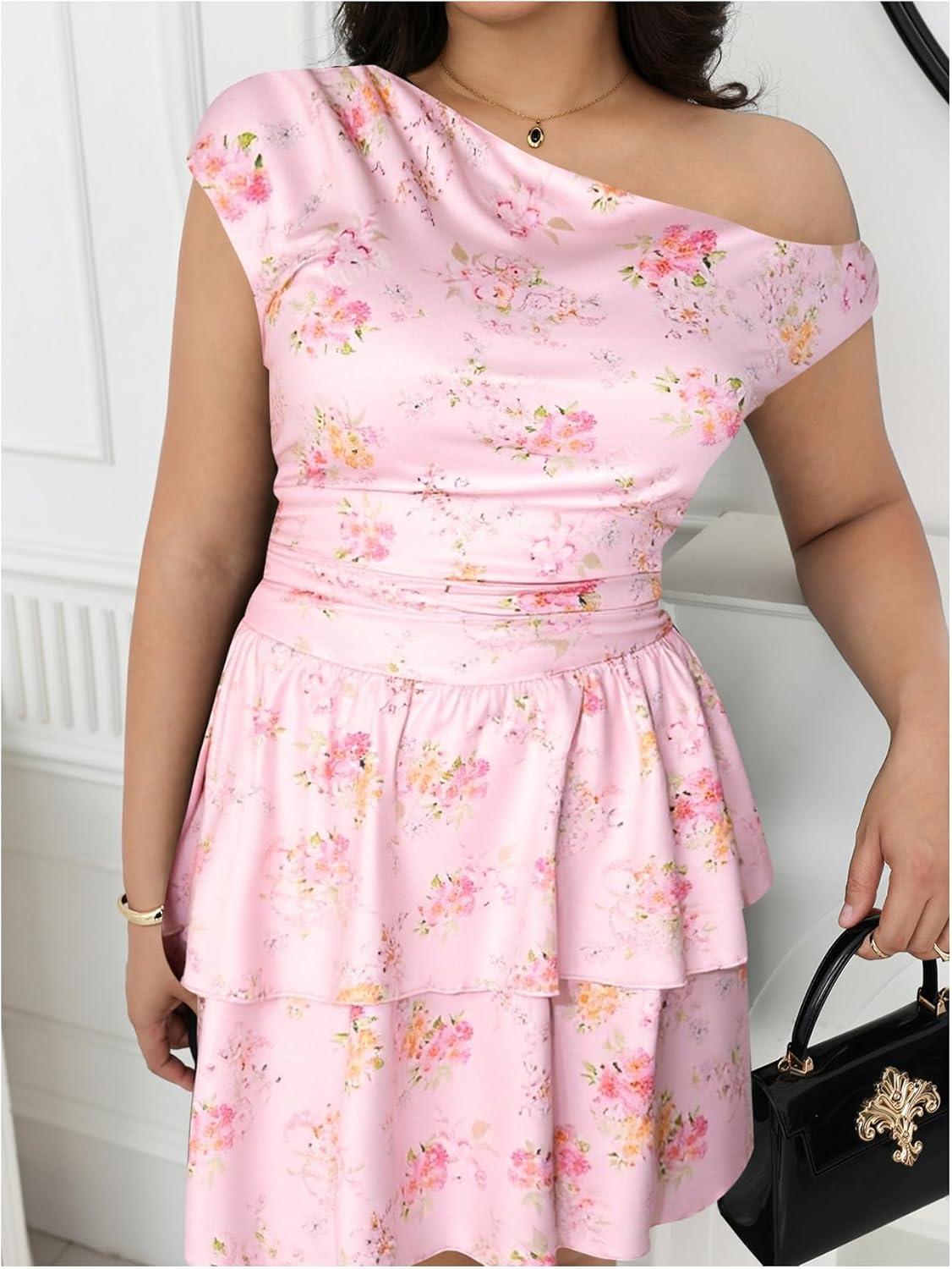 MakeMeChic Women's Plus Size Summer Dress Asymmetrical Neck Mini Dress Ruffle Tiered Cocktail Dresses(Pink a)