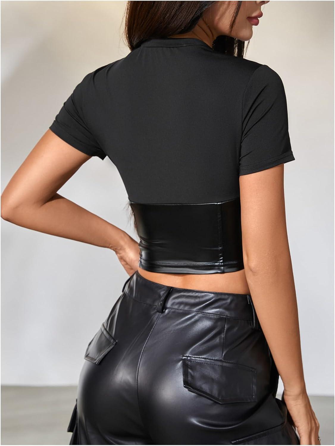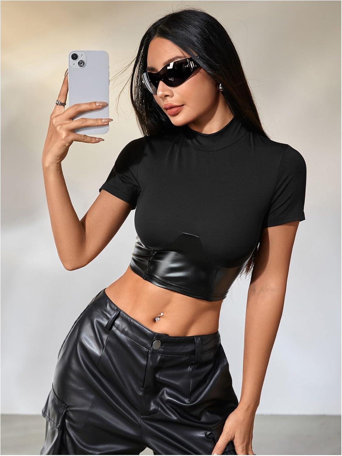 MakeMeChic Women’s PU Leather Crop Top Short Sleeve Mock Neck Slim Fitted Y2k Party Going Out Tops(Black)