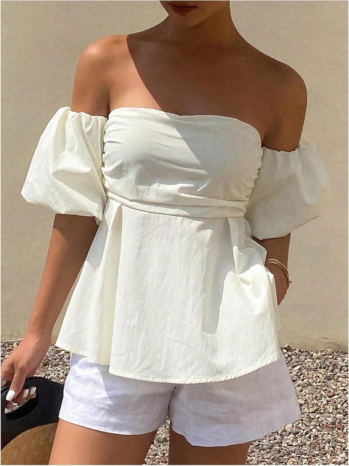imageMakeMeChic Womens Ruffle Peplum Tops Off The Shoulder Summer Blouse Tube TopWhite
