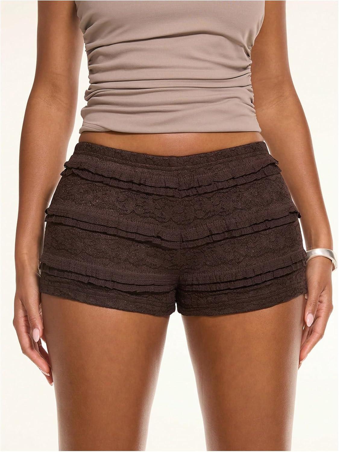 MakeMeChic Women's Ruffle Shorts Crochet Tiered Layered Summer Beach Micro Shorts(Brown)