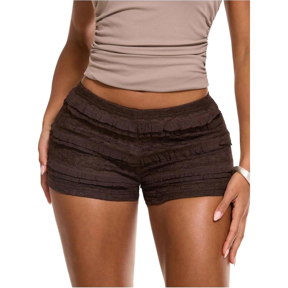 MakeMeChic Women’s Ruffle Shorts Crochet Tiered Layered Summer Beach Micro Shorts(Brown)