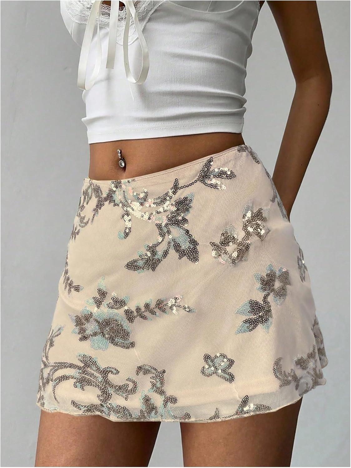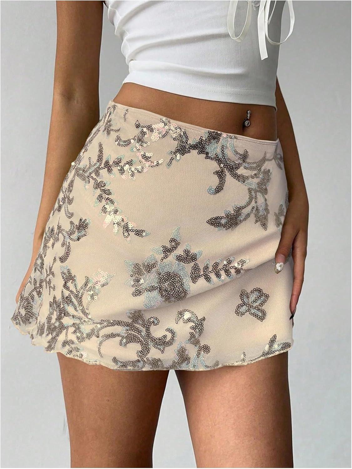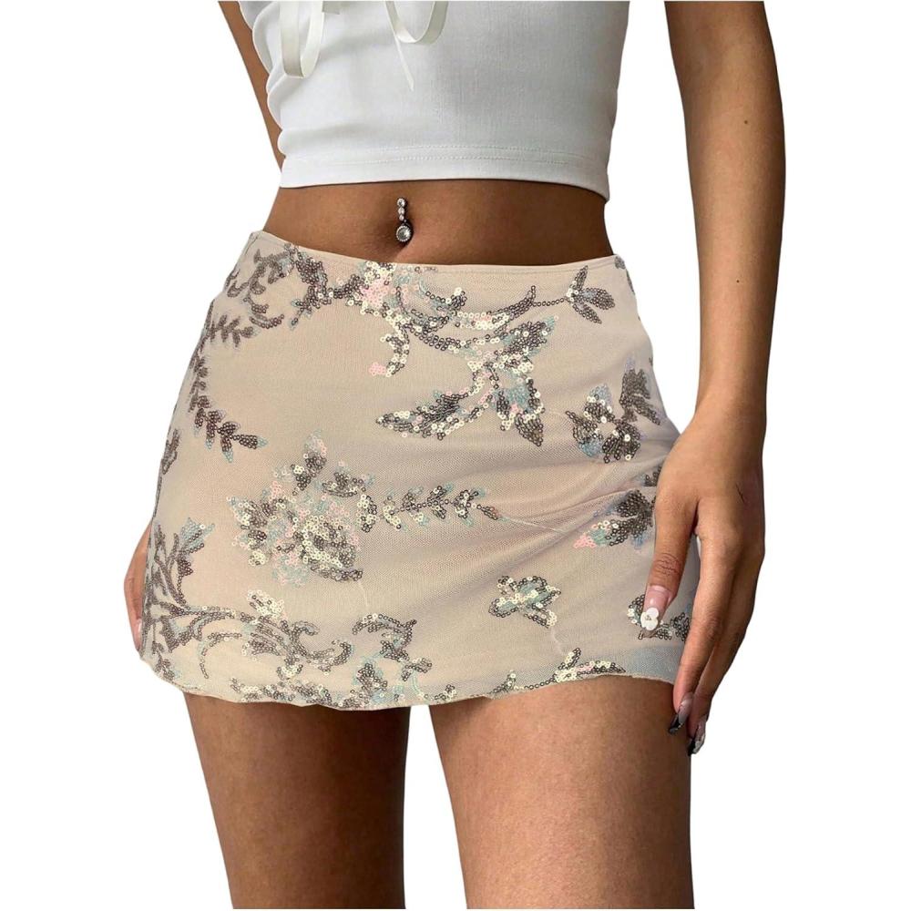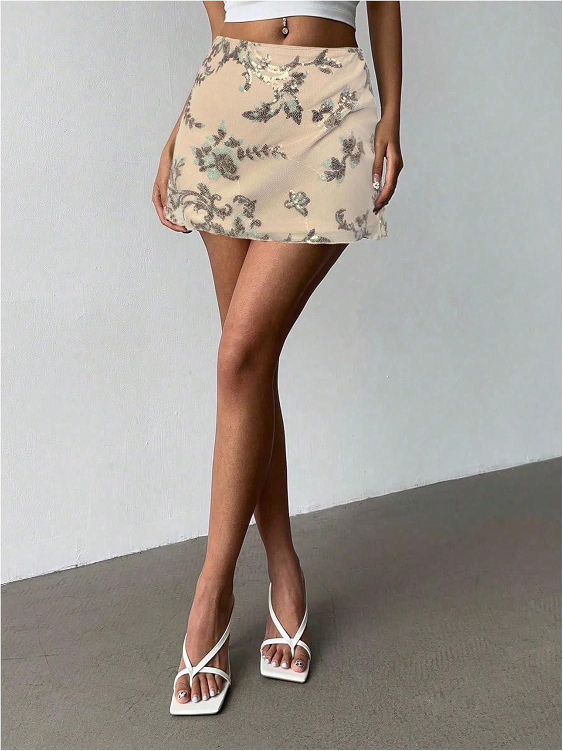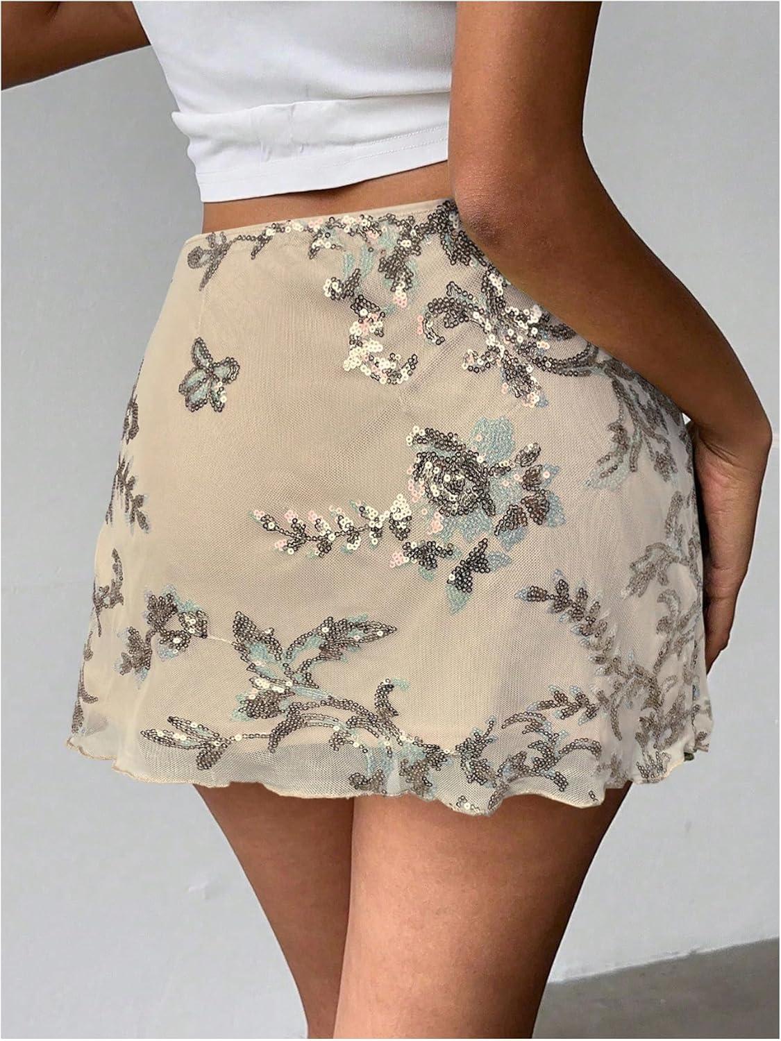 imageMakeMeChic Womens Sequin Skirt Summer Floral Mesh Glitter Sparkly Mini SkirtMulti Apricot