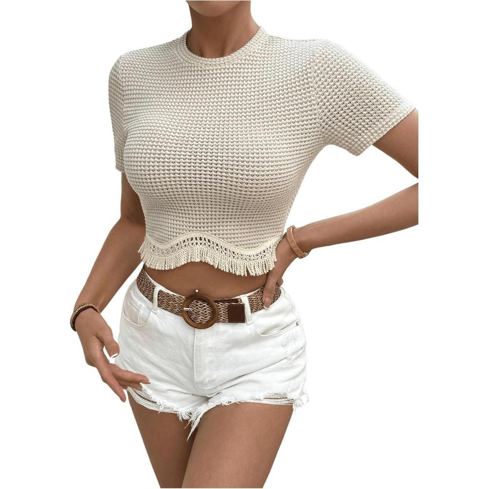 Get your hands on our exclusive MakeMeChic Women’s Short Sleeve Slim Fit Crop Tops Crew Neck Fringe Trim Tee Shirt(Apricot) collection, now at a discounted price.