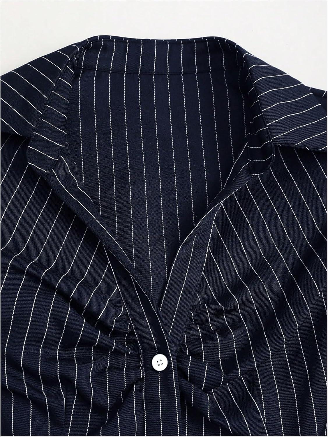 MakeMeChic Women’s Striped Button Down Shirt Puff Sleeve Collared Fall Work Office Blouse Top(Blue)