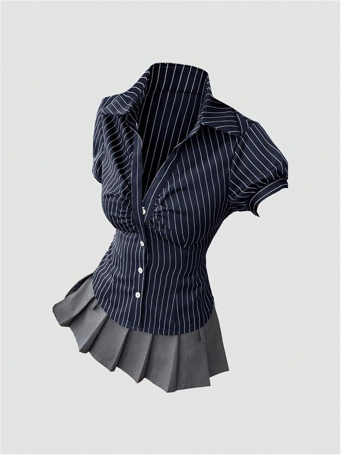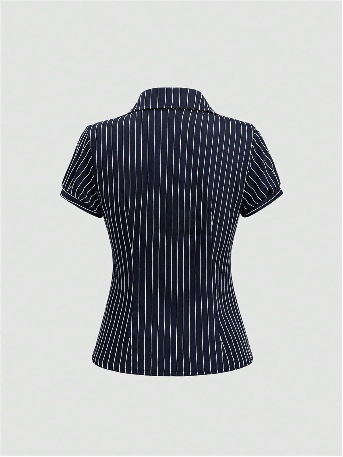 MakeMeChic Women’s Striped Button Down Shirt Puff Sleeve Collared Fall Work Office Blouse Top(Black)