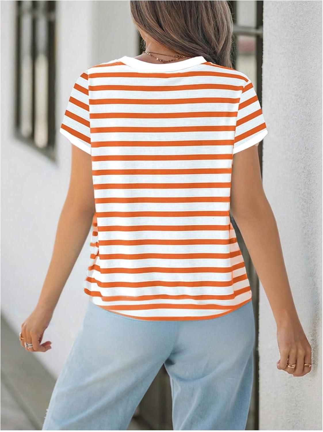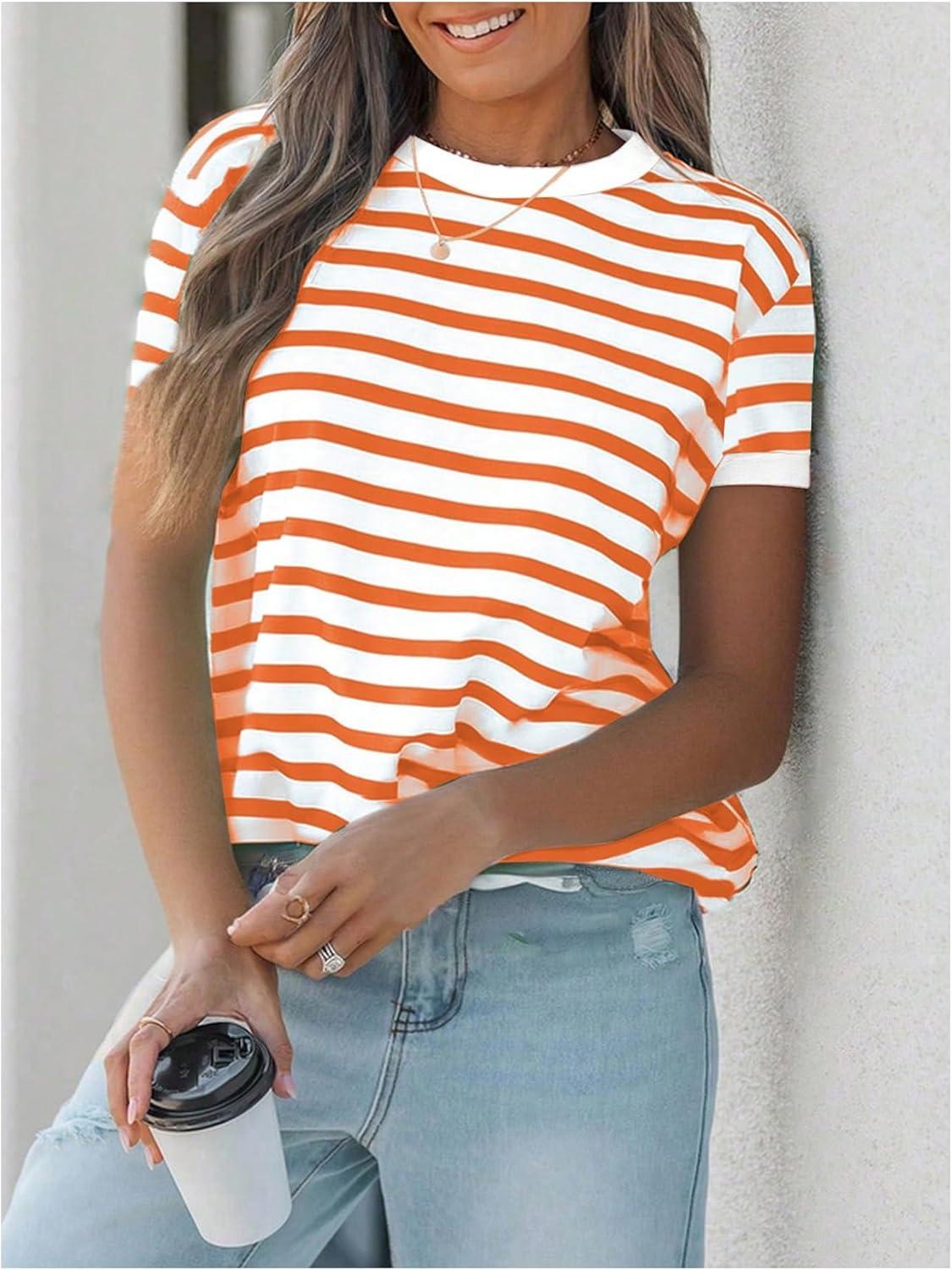 MakeMeChic Women's Striped Tee Crew Neck Contrast Binding Short Sleeve Going Out T Shirt Tops(Orange)