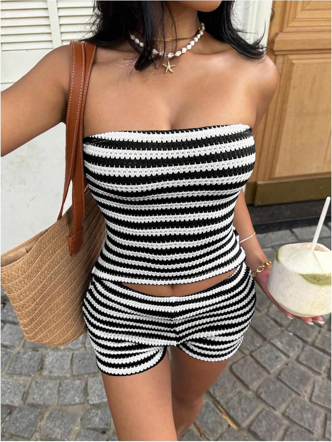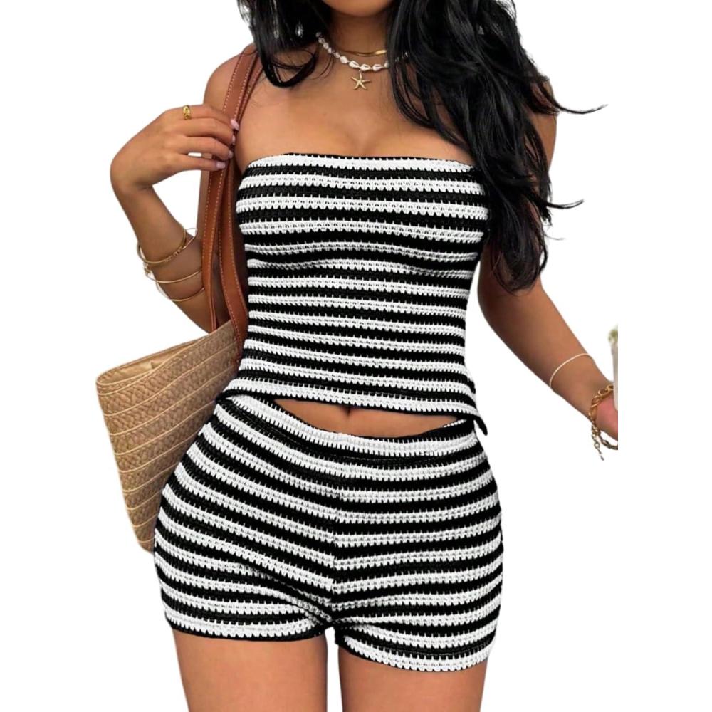 MakeMeChic Women’s Summer 2 Piece Sets Striped Open Back Strapless Tube Tops Mini Micro Shorts Set(Black White)