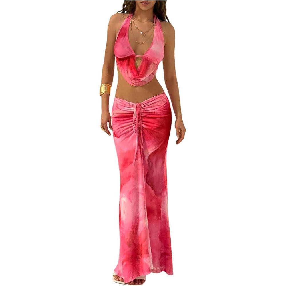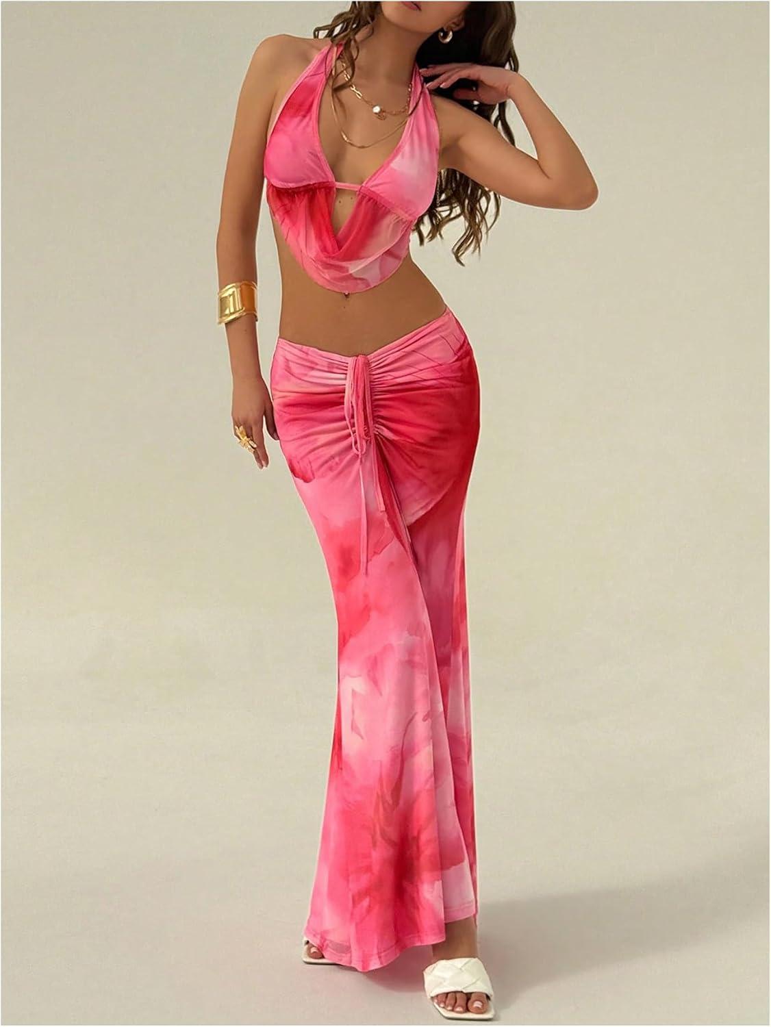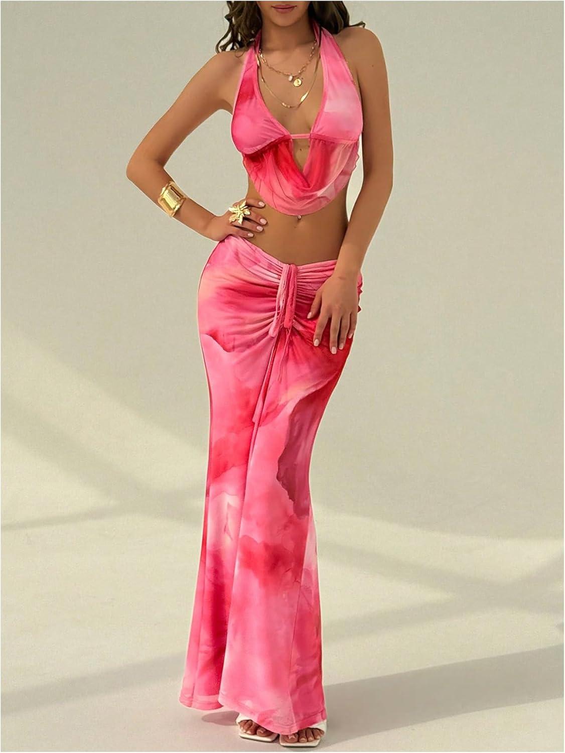 MakeMeChic Women’s Summer 2 Piece Sets Tie Dye Backless Halter Tops Flare Maxi Skirt Set(Pink)