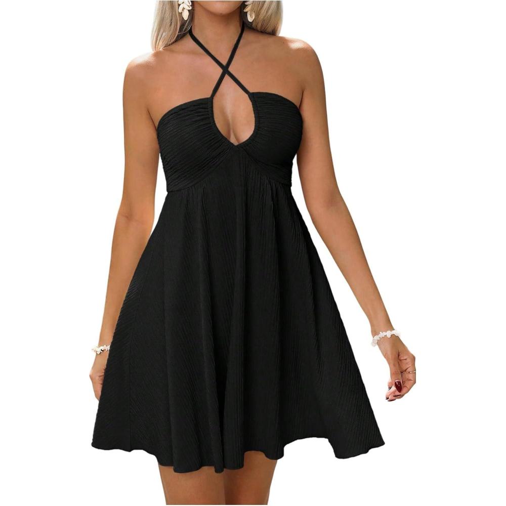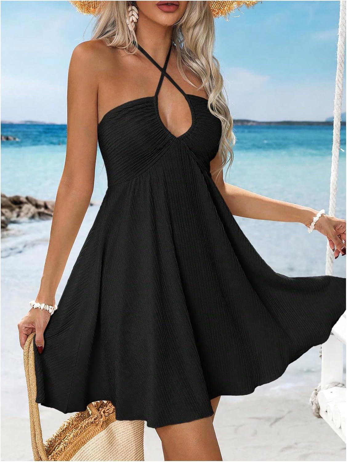 MakeMeChic Women’s Summer Halter Dress Cut Out Tie Backless Criss Cross Flowy Short Dresses Sundress(Black)