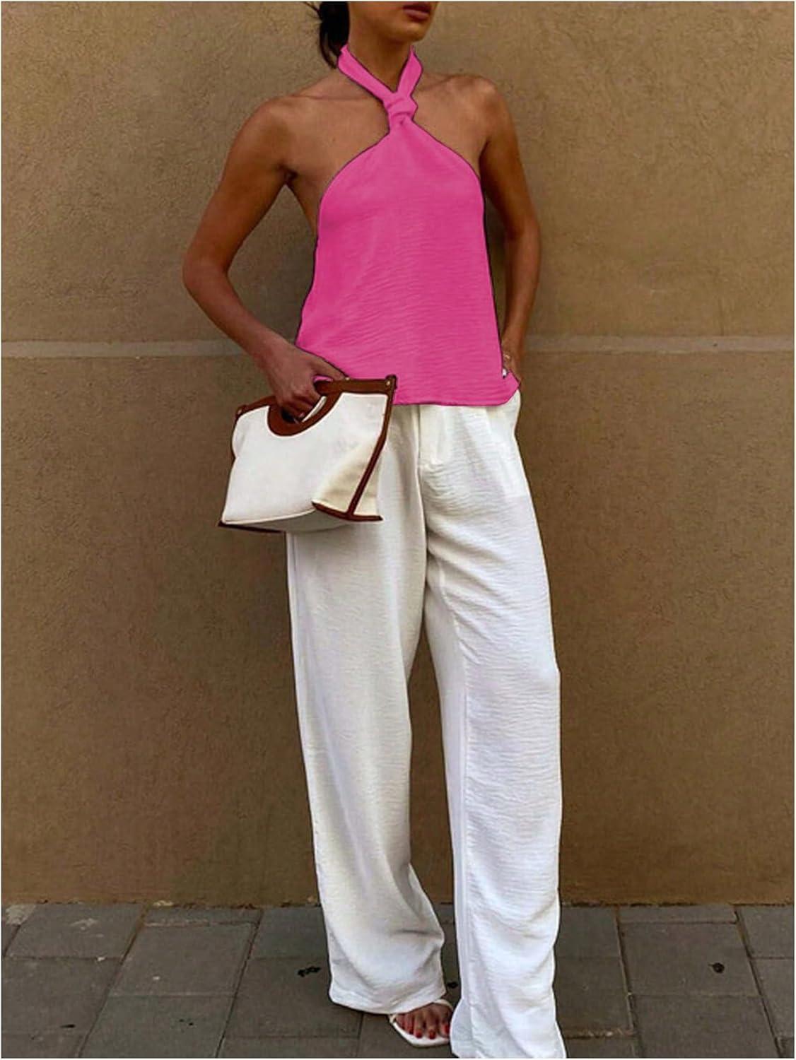 MakeMeChic Women’s Summer Halter Tops Criss Cross Casual Sleeveless Tie Backless Textured Shirt(Hot Pink)