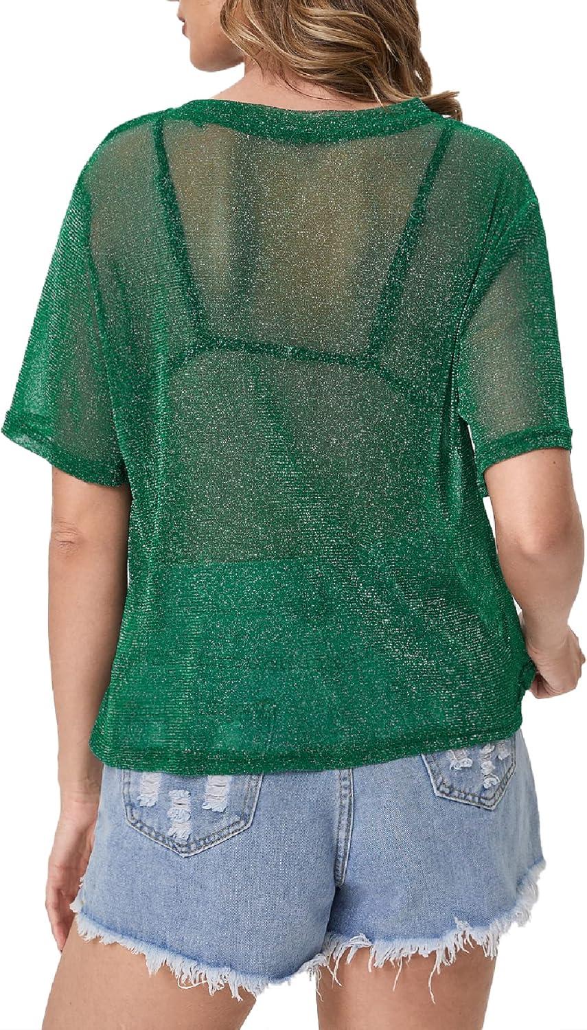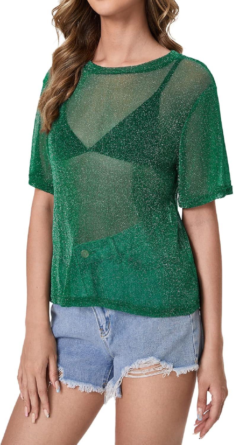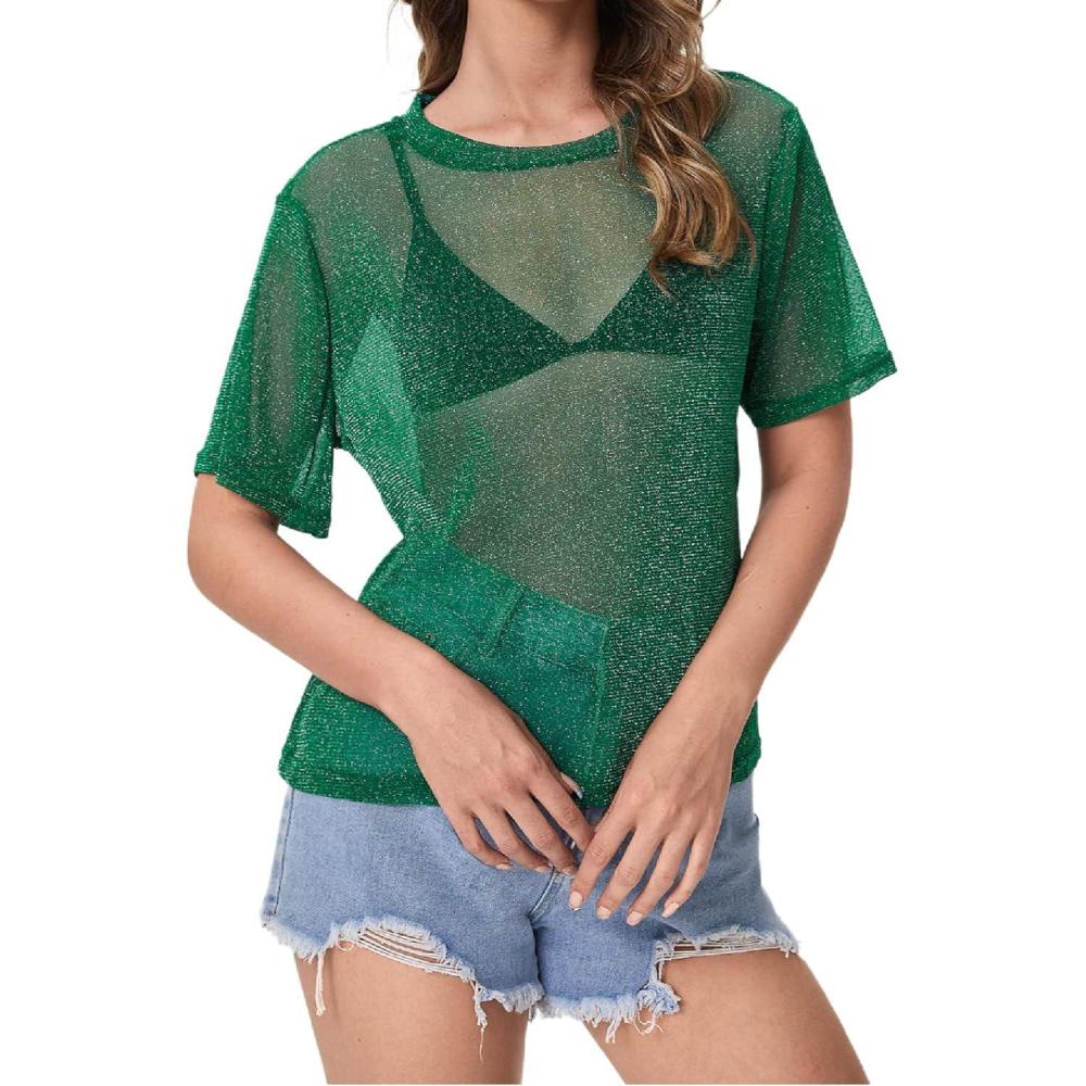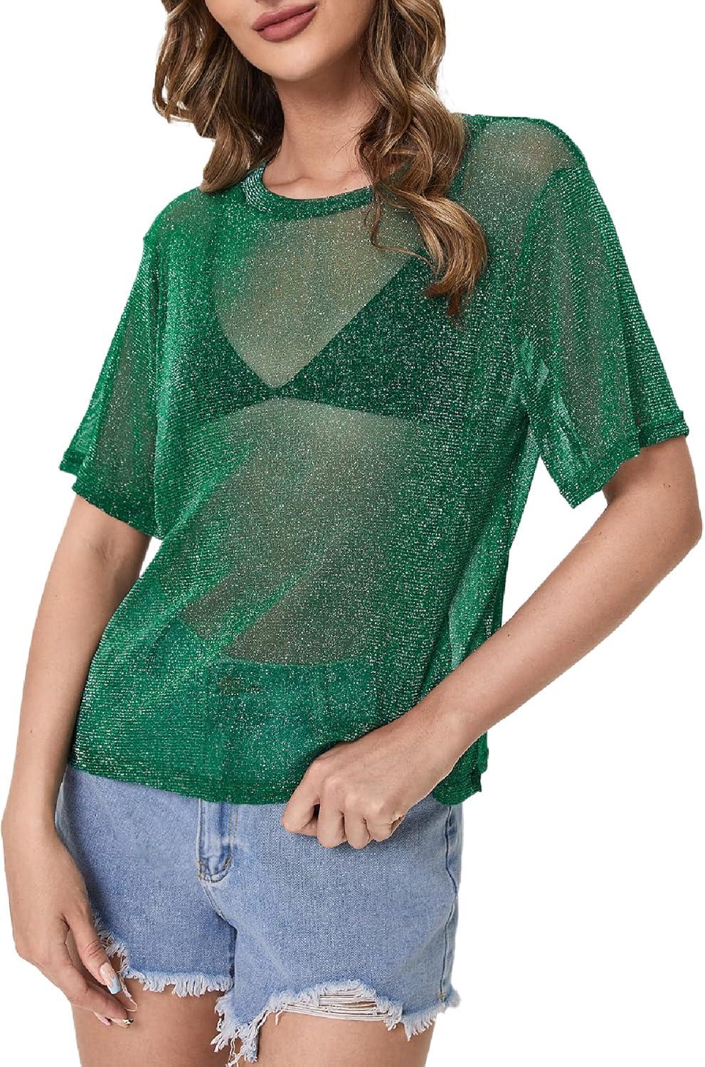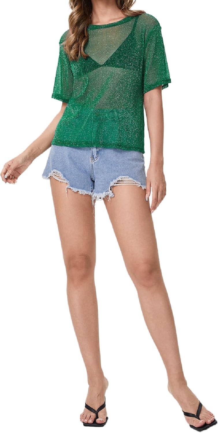 MakeMeChic Women’s Summer Short Sleeve Tops Rock Concert Outfits Sequin See Through Mesh Sheer T Shirts Blouse(Dark Green Glitter)