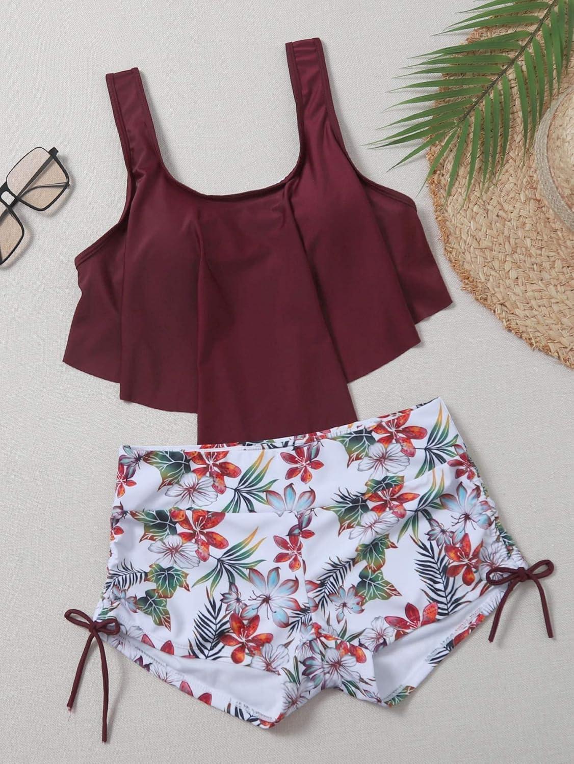 imageMakeMeChic Womens Swimsuits Two Piece Bathing Suits Ruffled Flounce Top High Waisted Bottom Bikini SetBurgundy Floral