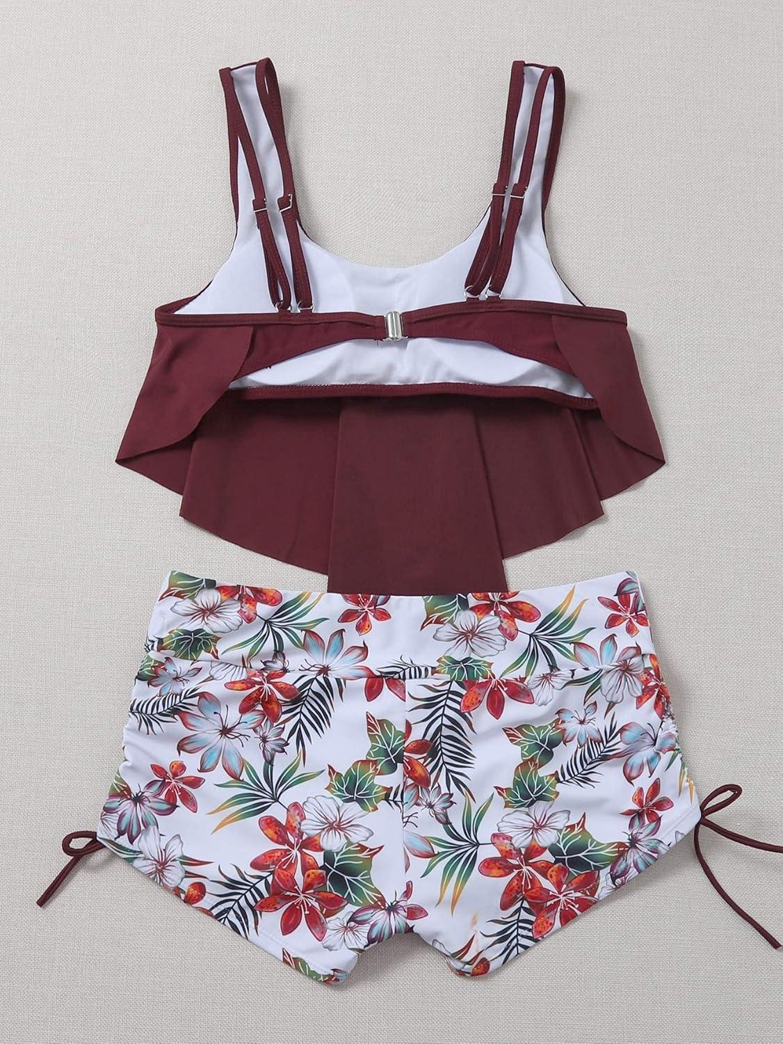 MakeMeChic Women's Swimsuits Two Piece Bathing Suits Ruffled Flounce Top High Waisted Bottom Bikini Set(Burgundy Floral)