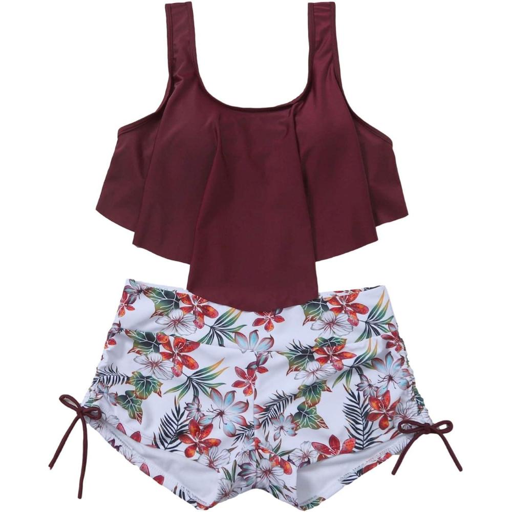 MakeMeChic Women’s Swimsuits Two Piece Bathing Suits Ruffled Flounce Top High Waisted Bottom Bikini Set(Burgundy Floral)