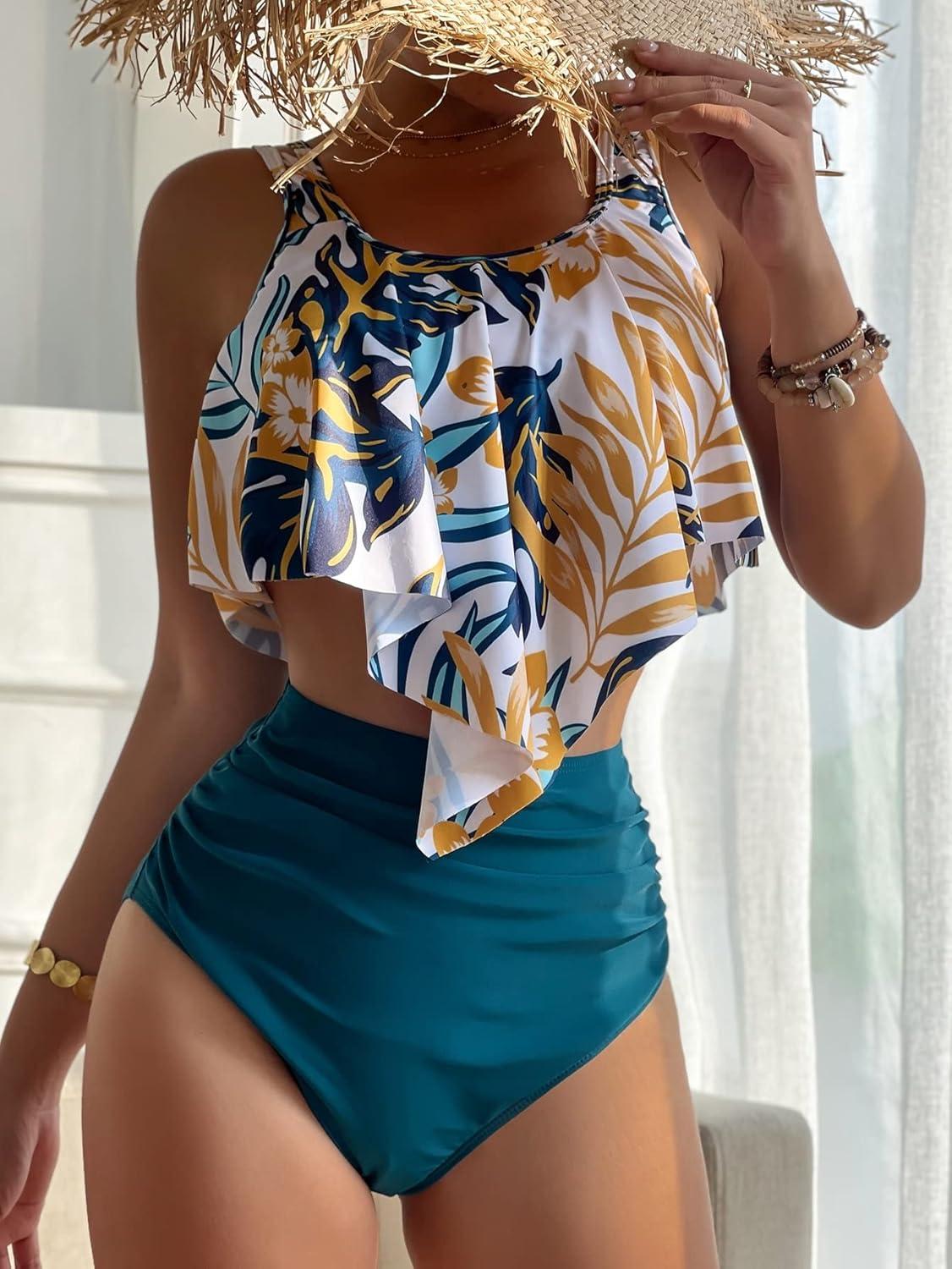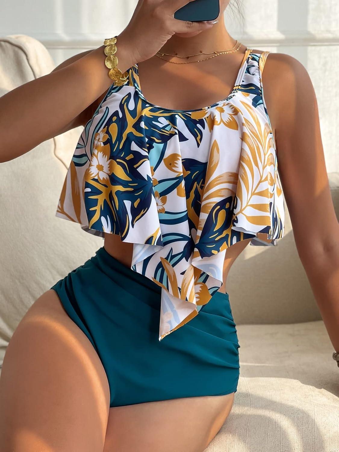MakeMeChic Women's Swimsuits Two Piece Bathing Suits Ruffled Flounce Top High Waisted Bottom Bikini Set(Teal Blue)
