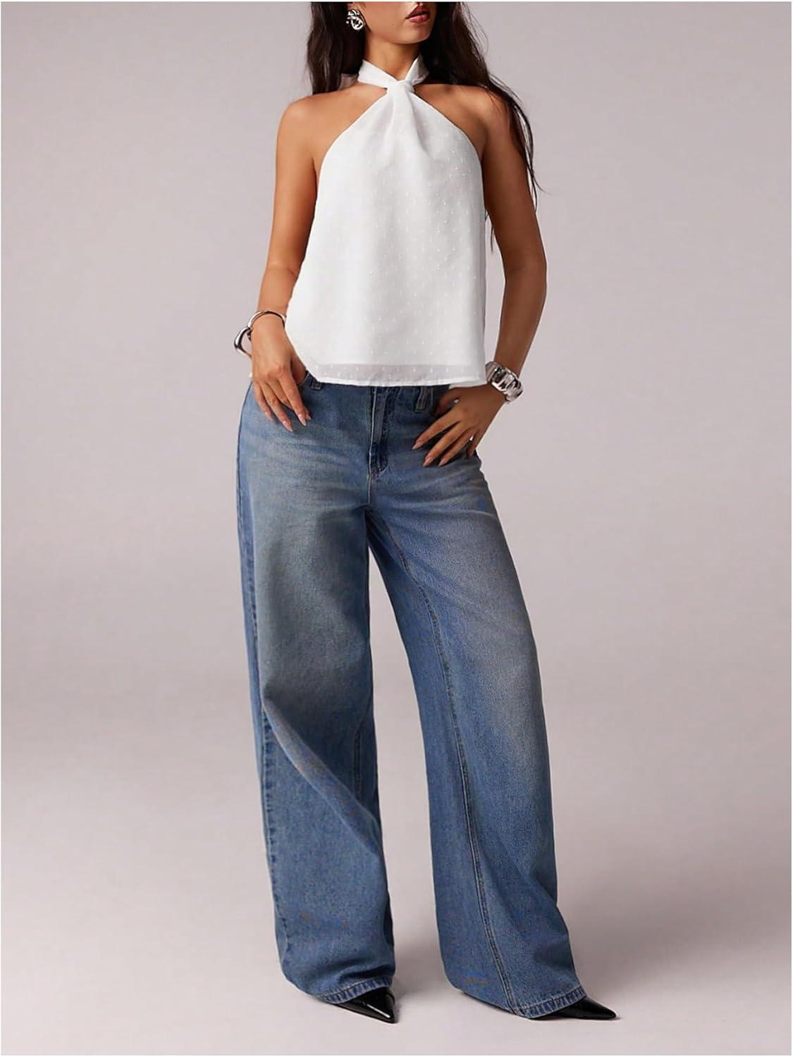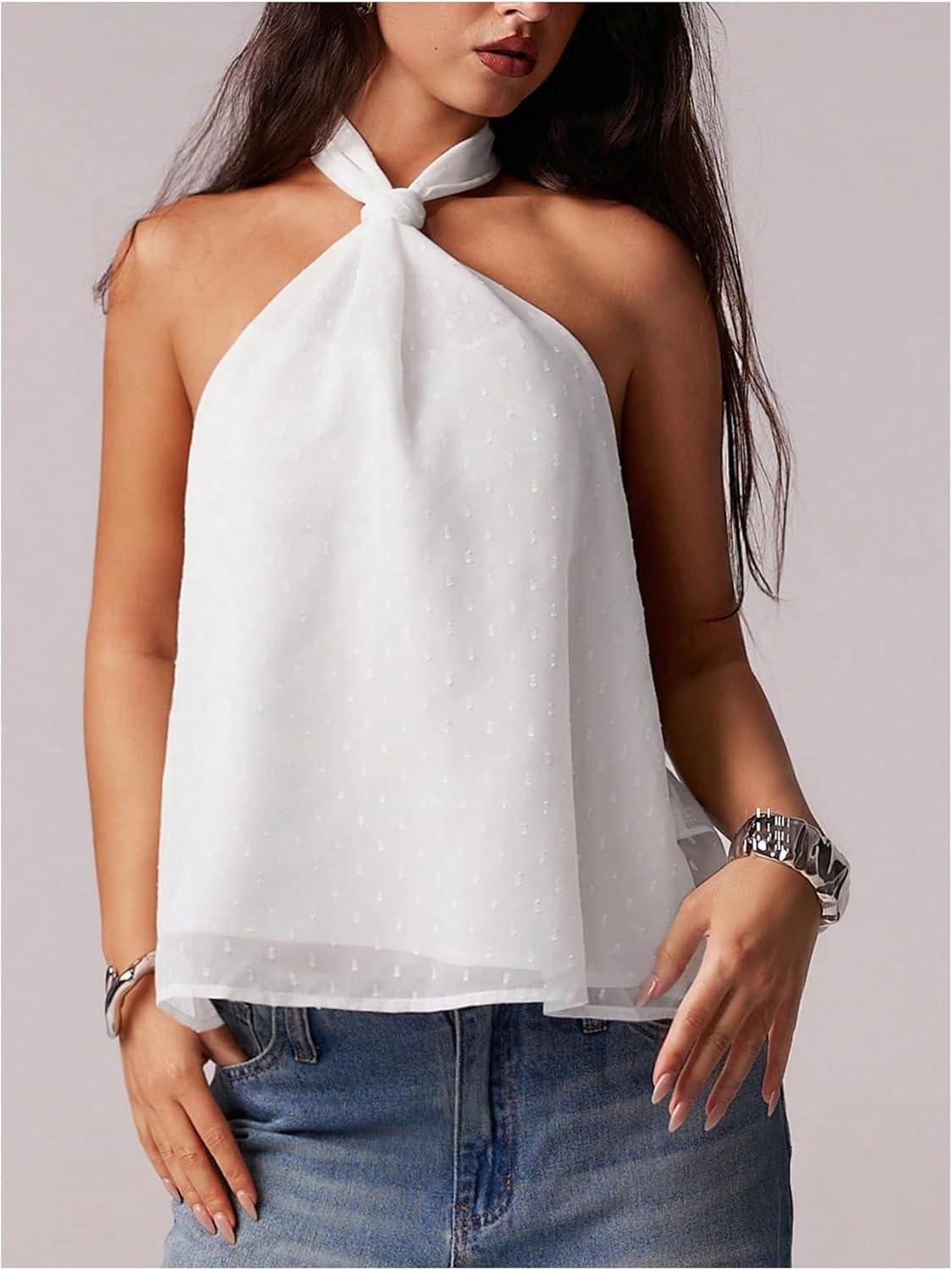 MakeMeChic Women’s Tie Back Halter Tops Swiss Dots Knot Backless Sleeveless Tank(White)
