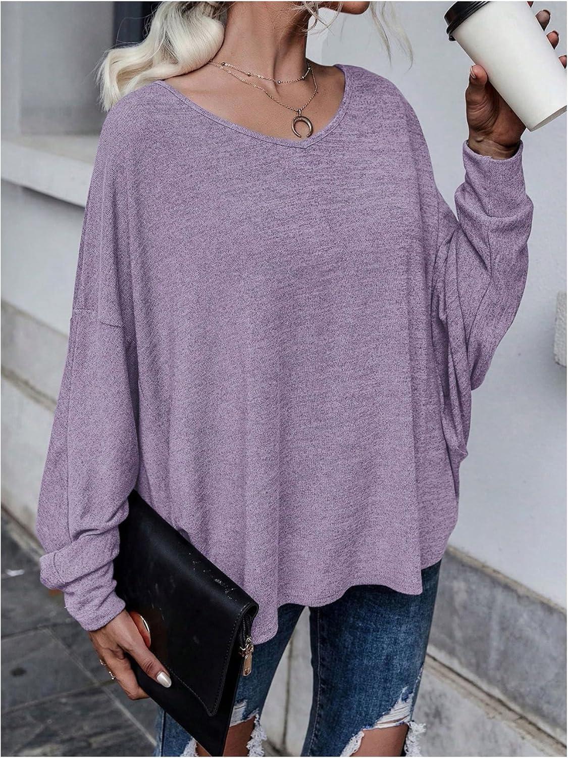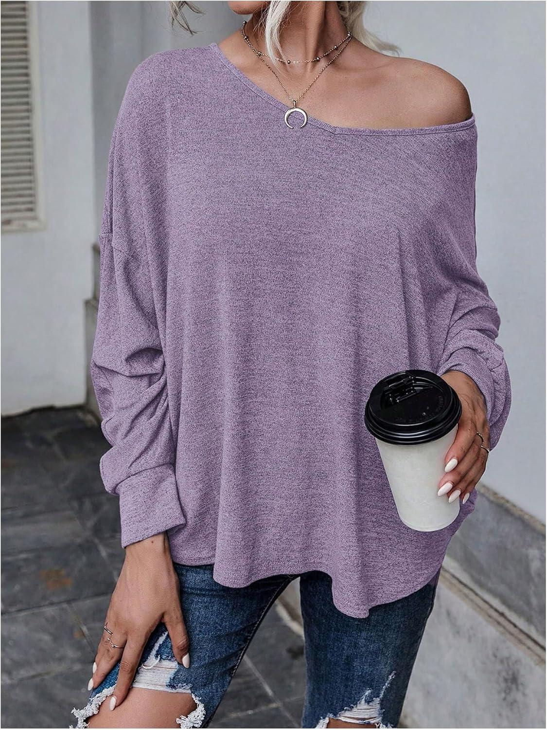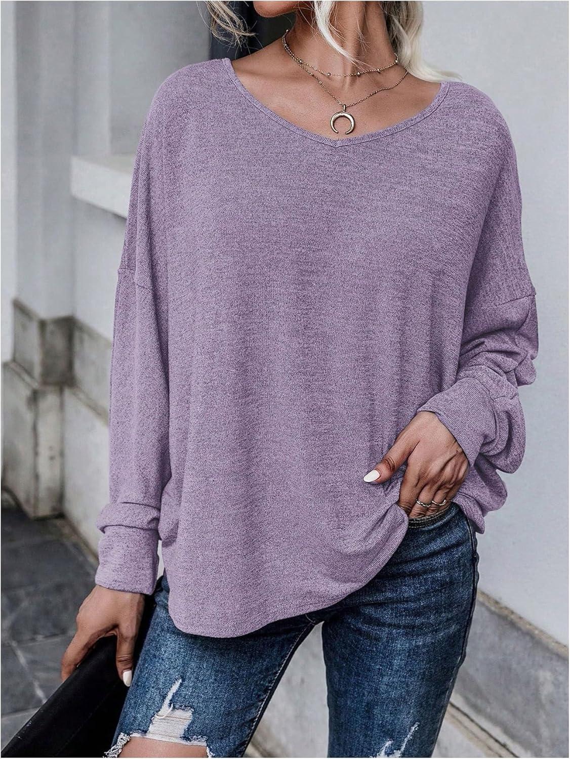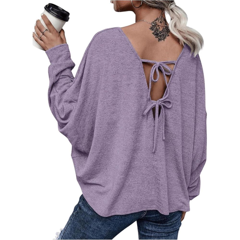 MakeMeChic Women’s Tie Back Tops V Neck Long Sleeve Off Shoulder Casual Tee Shirt Top(Purple)