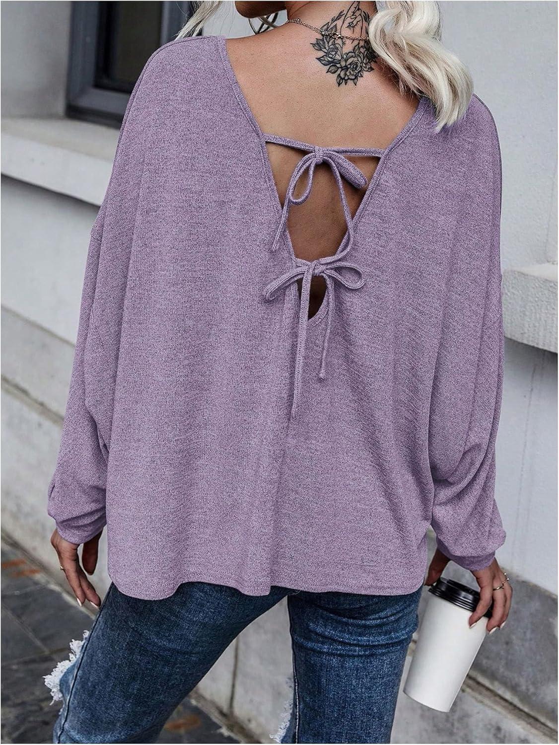 MakeMeChic Women's Tie Back Tops V Neck Long Sleeve Off Shoulder Casual Tee Shirt Top(Purple)