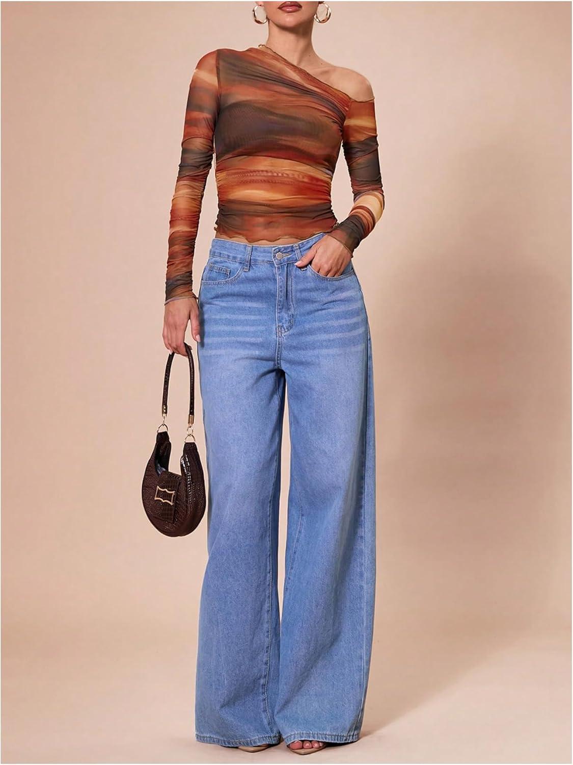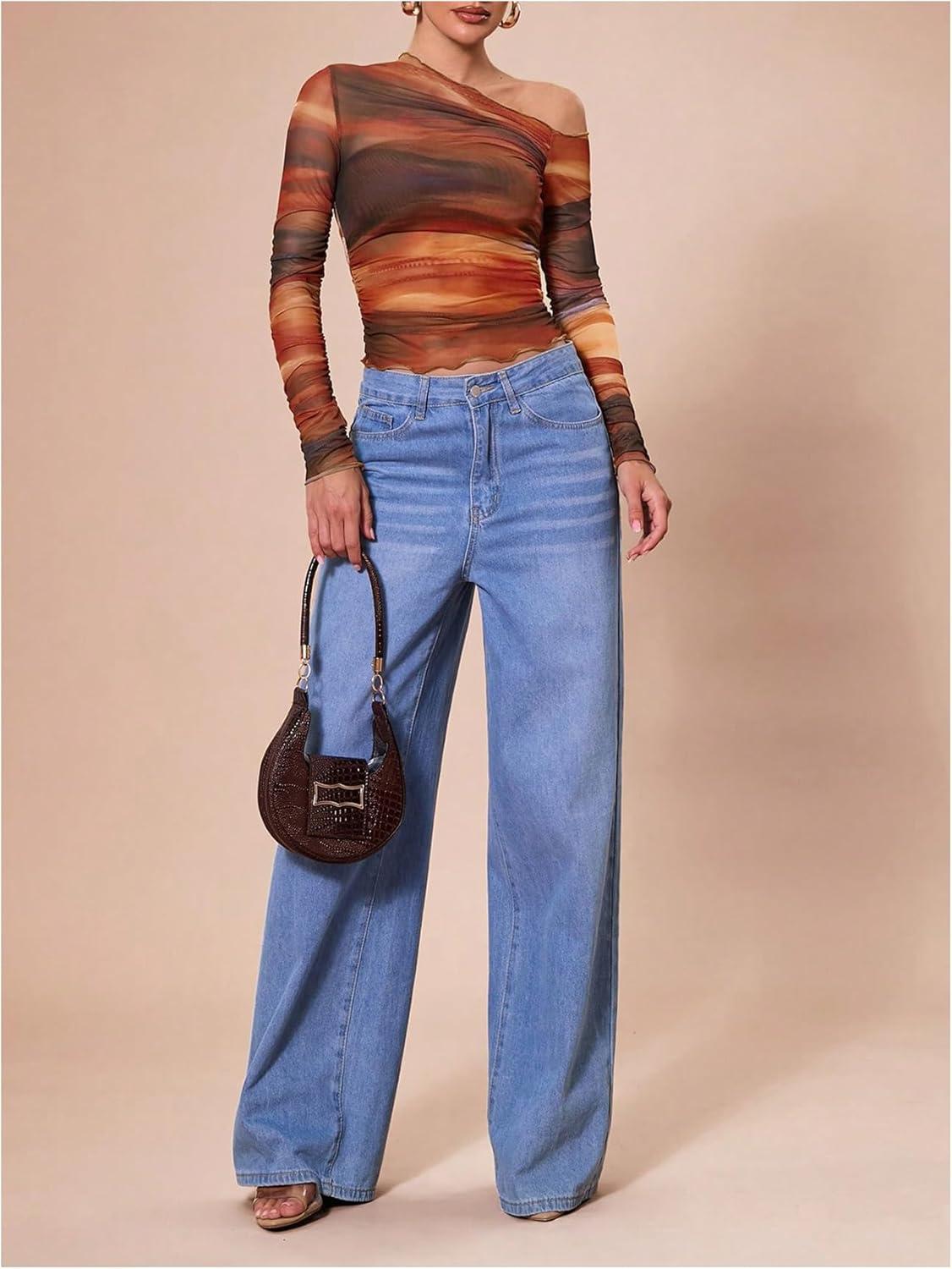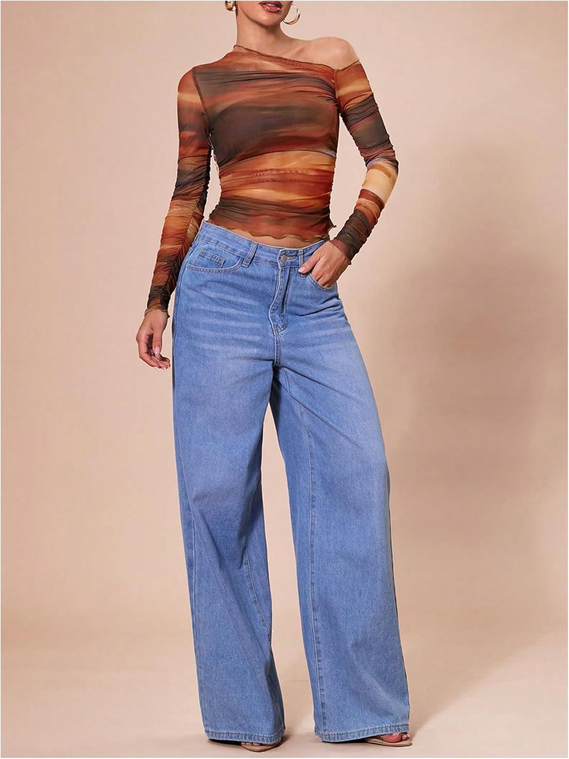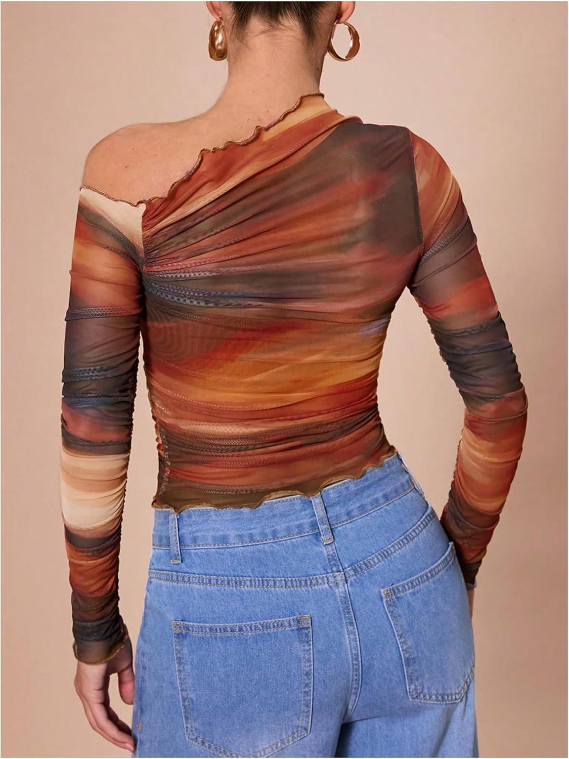 MakeMeChic Women’s Tie Dye Asymmetrical Neck Long Sleeve Ruched Tee Shirt Crop Tops(Multicolor)