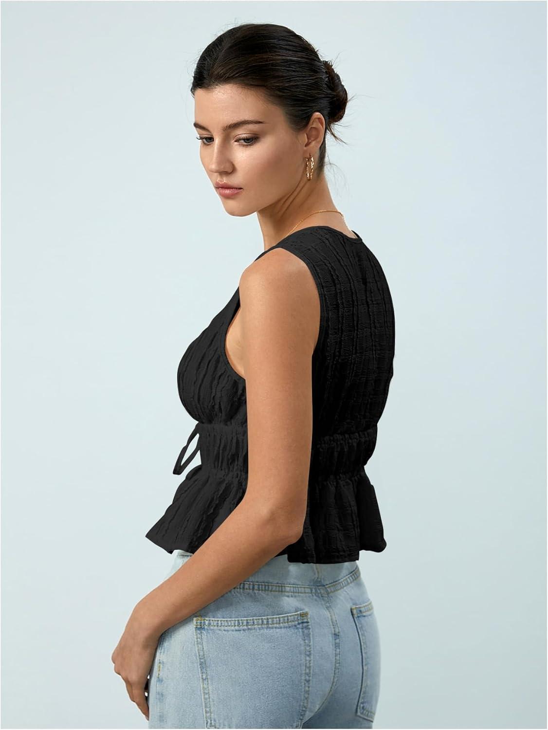 MakeMeChic Women's Tie Front Tank Top Sleeveless Ruffle Hem Crop Going Out Tops(Black)
