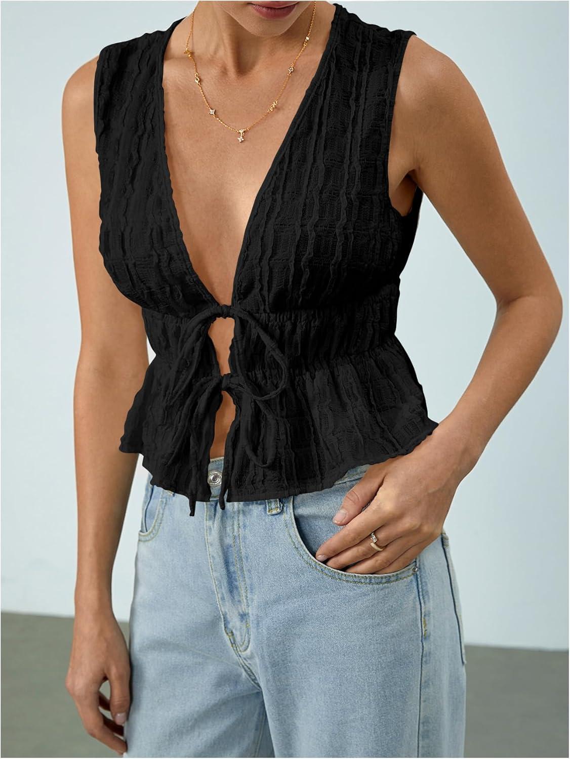 MakeMeChic Women’s Tie Front Tank Top Sleeveless Ruffle Hem Crop Going Out Tops(Black)