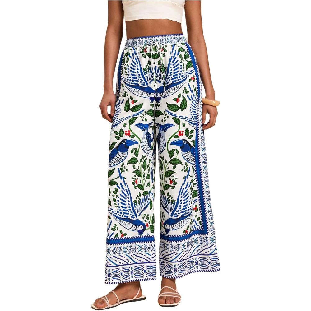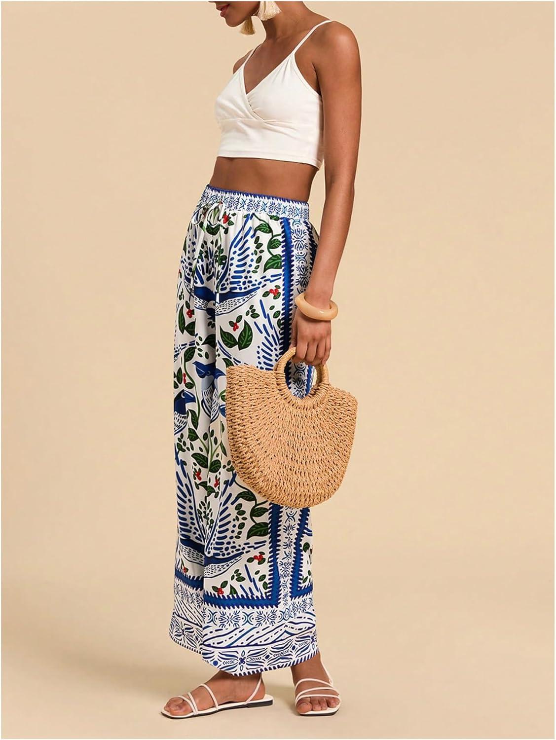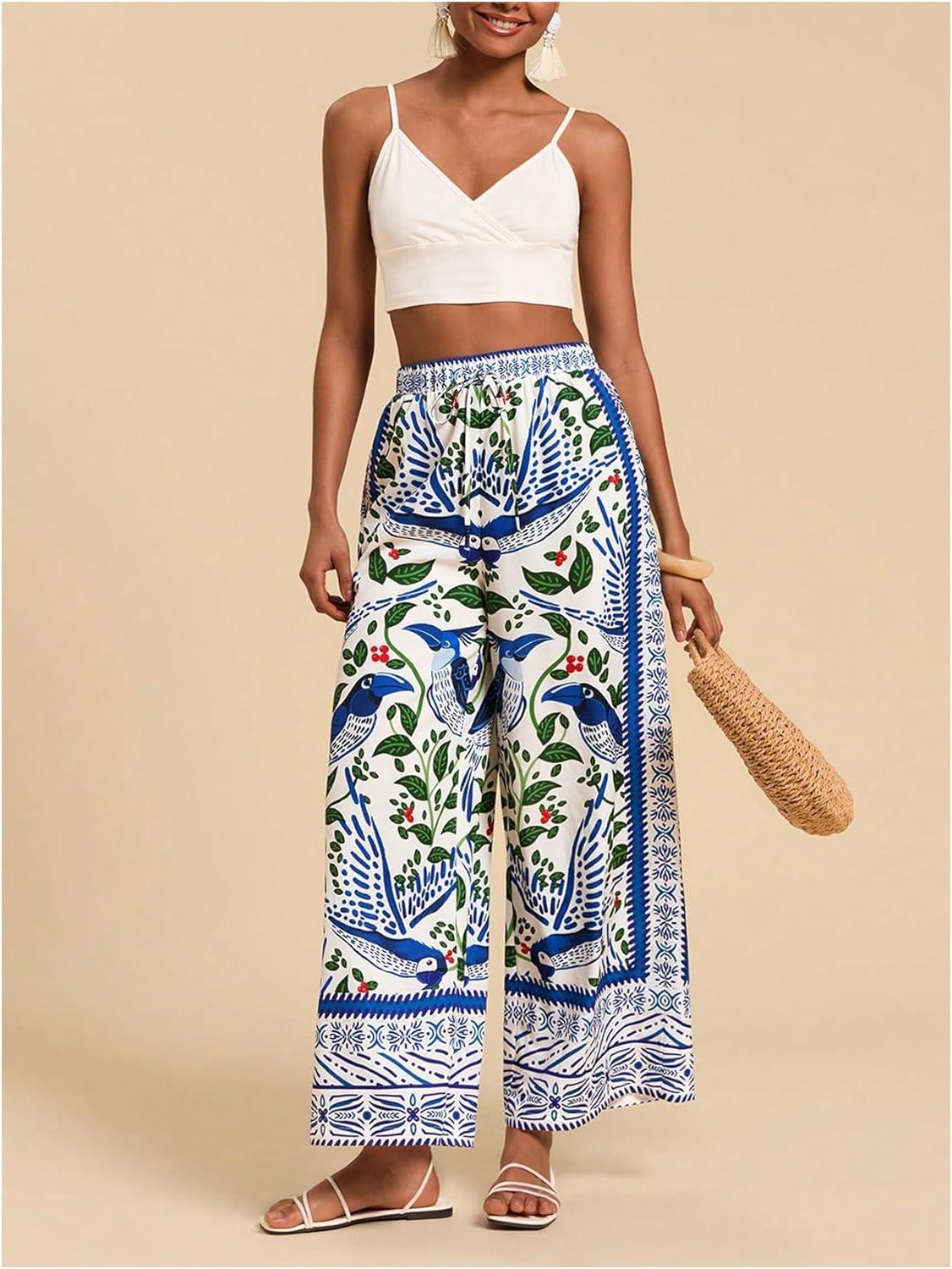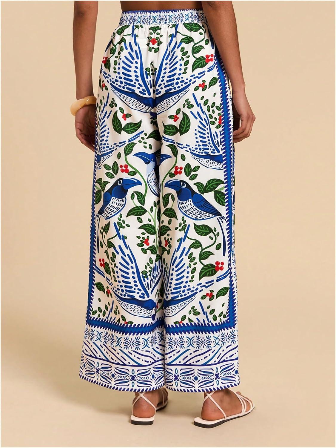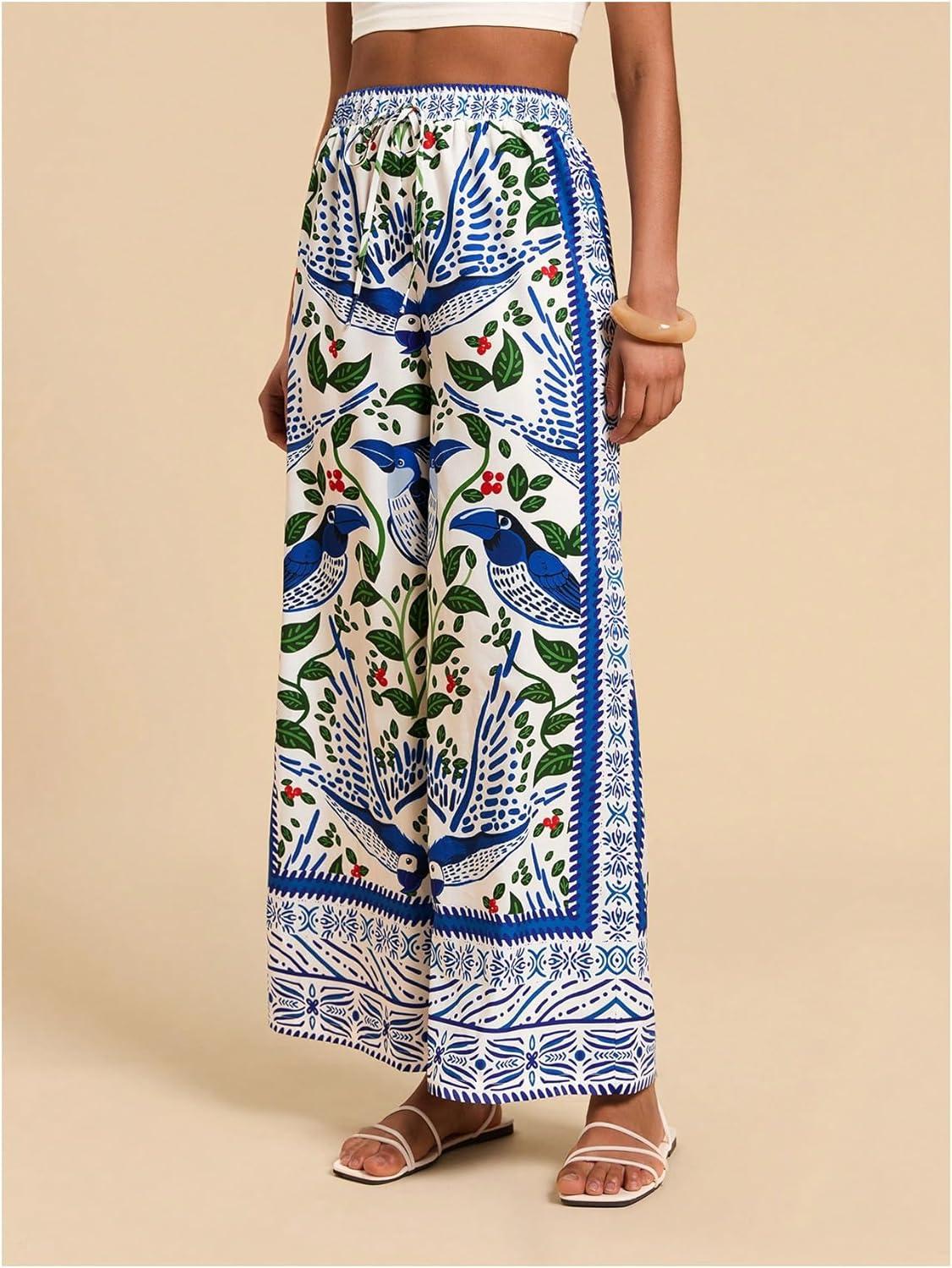 MakeMeChic Women's Tropical Boho Print Wide Leg Palazzo Pants High Waist Drawstring Baggy Trousers(Multicolor)