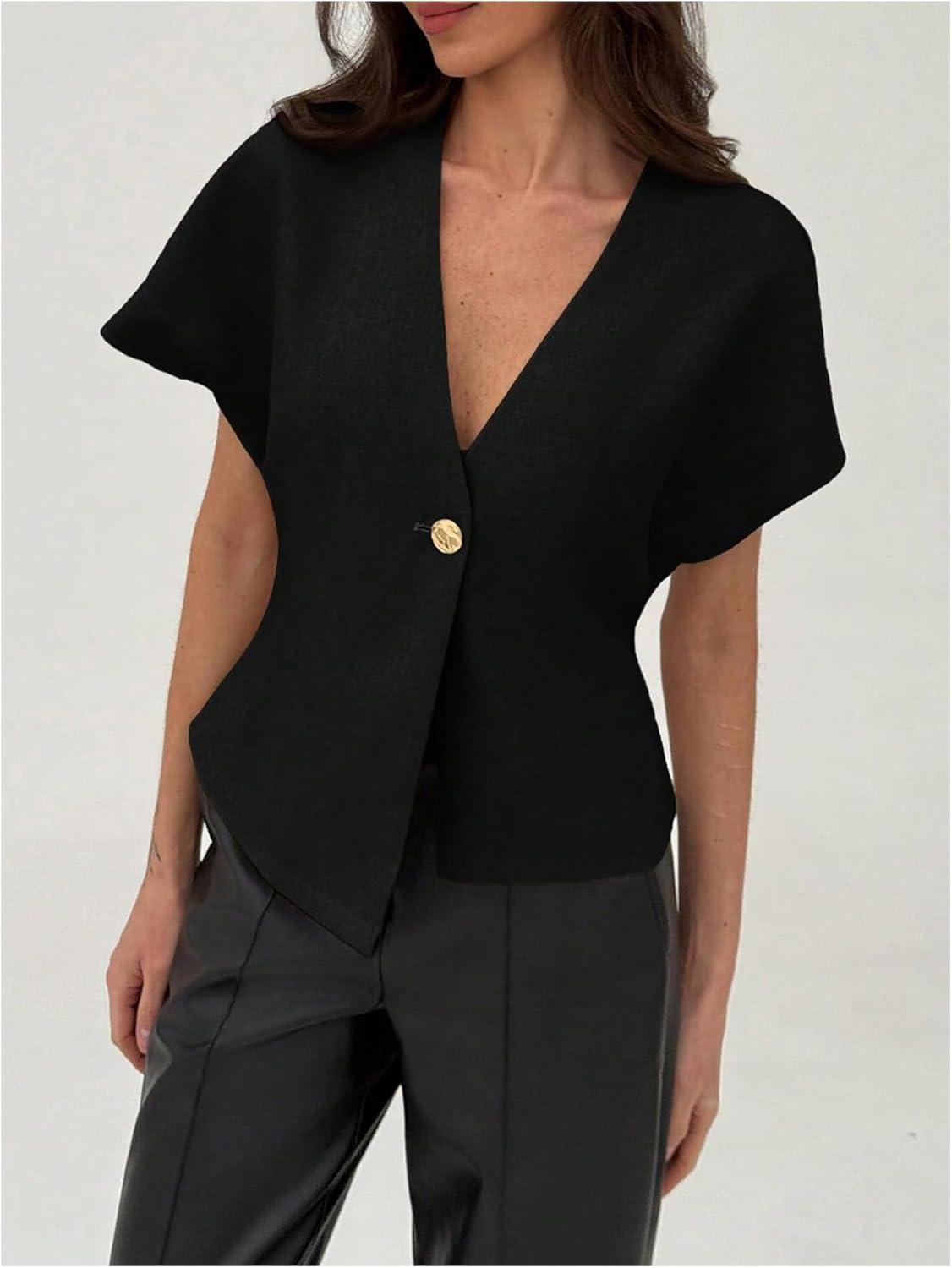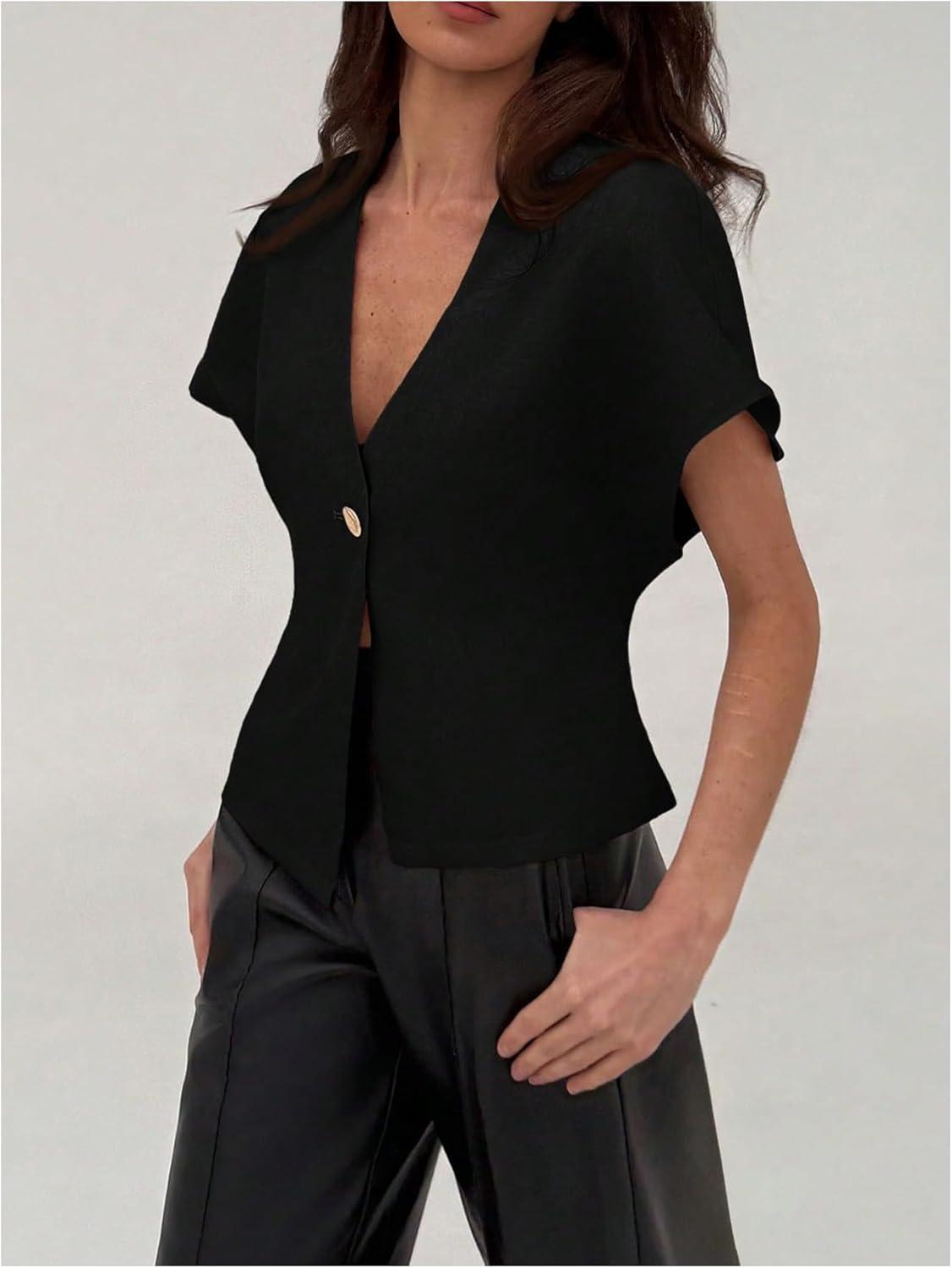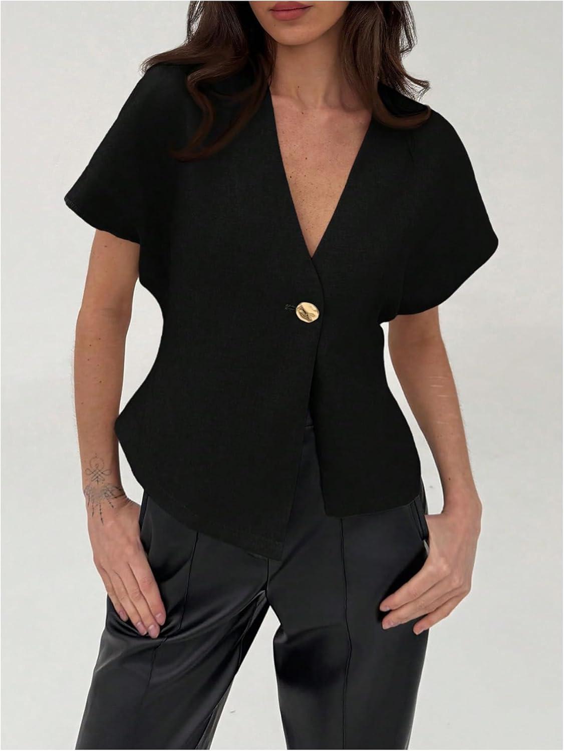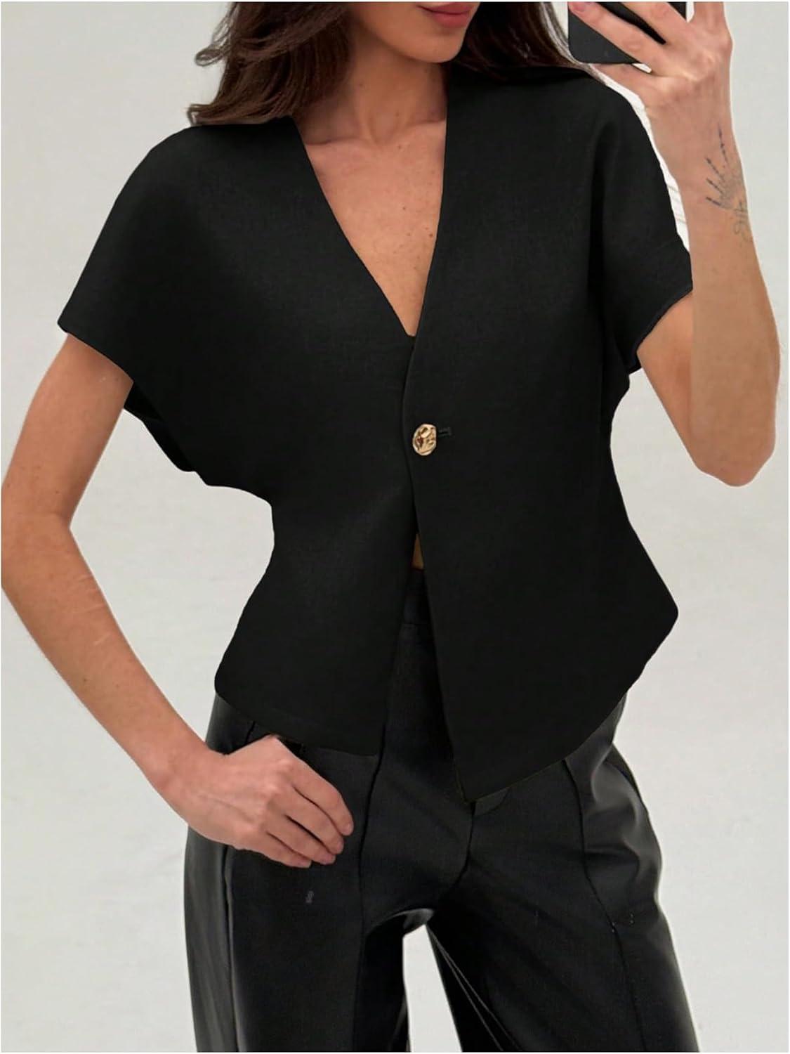 MakeMeChic Women's V Neck Blazer Top Single Button Short Sleeve Plain Office Suit Blazers(Black)